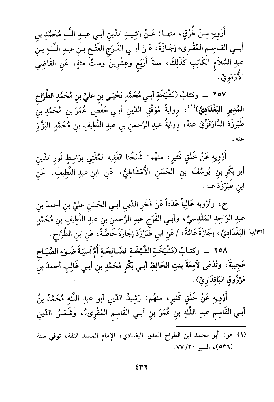 257- وكتاب (مشيخة أبي محمدٍ يحيى بن علي بن محمدٍ الطراح المدير البغدادي) ، رواية موفق الدين أبي حفص عمر بن محمد بن طبرزد الدارقزي عنه، رواية عبد الرحمن بن عبد اللطيف بن محمدٍ البزاز عنه.