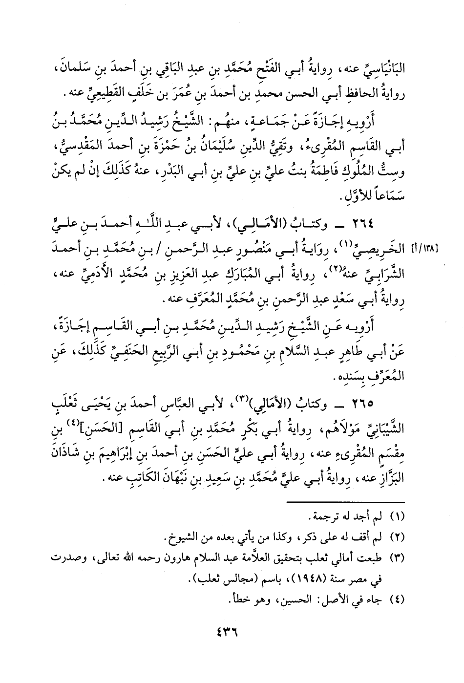 265- وكتاب (الأمالي) ، لأبي العباس أحمد بن يحيى ثعلب الشيباني مولاهم، رواية أبي بكر محمد بن أبي القاسم [الحسن] بن مقسم المقرئ عنه، رواية أبي علي الحسن بن أحمد بن إبراهيم بن شاذان البزاز عنه، رواية أبي علي محمد بن سعيد بن نبهان الكاتب عنه.