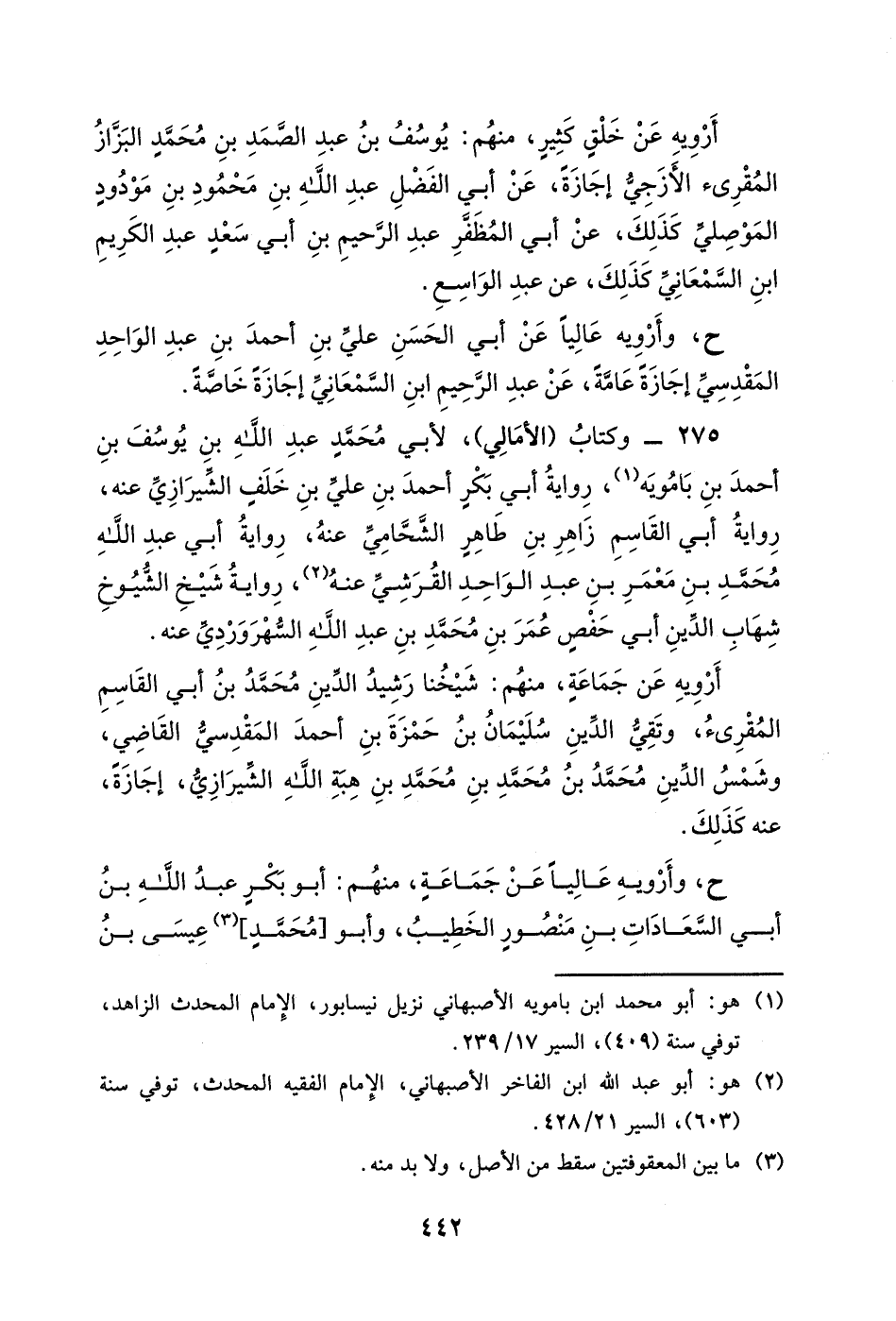 275- وكتاب (الأمالي) ، لأبي محمد عبد الله بن يوسف بن أحمد بن بامويه، رواية أبي بكرٍ أحمد بن علي بن خلفٍ الشيرازي عنه، رواية أبي القاسم زاهر بن طاهر الشحامي عنه، رواية أبي عبد الله محمد بن معمر بن عبد الواحد القرشي عنه، رواية شيخ الشيوخ شهاب الدين أبي حفصٍ عمر بن محمد بن عبد الله السهروردي عنه.