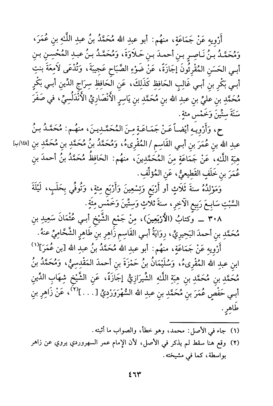 308- وكتاب (الأربعين) ، من جمع الشيخ أبي عثمان سعيد بن محمد بن أحمد البحيري، رواية أبي القاسم زاهر بن طاهرٍ الشحامي عنه.