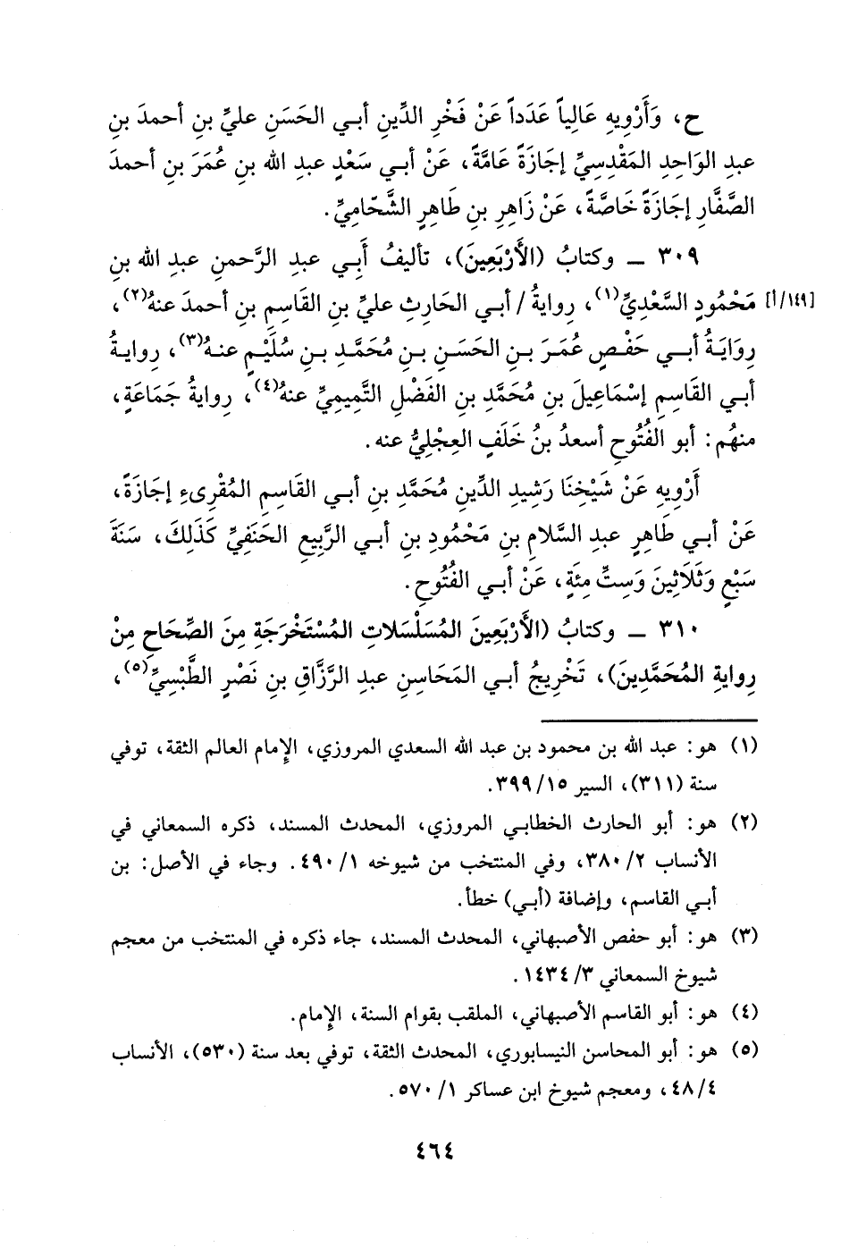 309- وكتاب (الأربعين) ، تأليف أبي عبد الرحمن عبد الله بن محمود السعدي، رواية أبي الحارث علي بن القاسم بن أحمد عنه، رواية أبي حفصٍ عمر بن الحسن بن محمد بن سليم عنه، رواية أبي القاسم إسماعيل بن محمد بن الفضل التميمي عنه، رواية جماعةٍ، منهم: أبو الفتوح أسعد بن خلفٍ العجلي عنه.