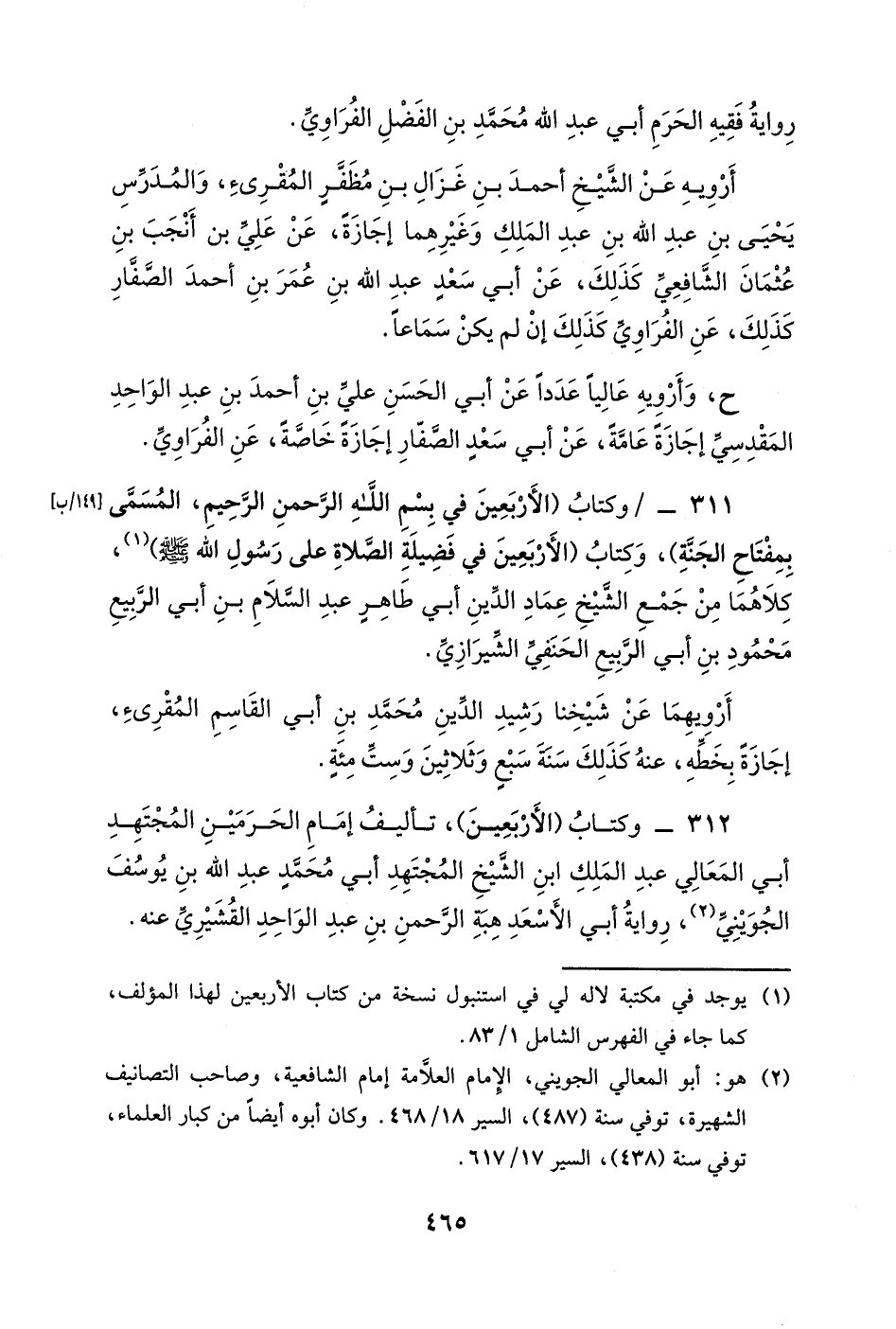 312- وكتاب (الأربعين) ، تأليف إمام الحرمين المجتهد أبي المعالي عبد الملك ابن الشيخ المجتهد أبي محمدٍ عبد الله بن يوسف الجويني، رواية أبي الأسعد هبة الرحمن بن عبد الواحد القشيري عنه.