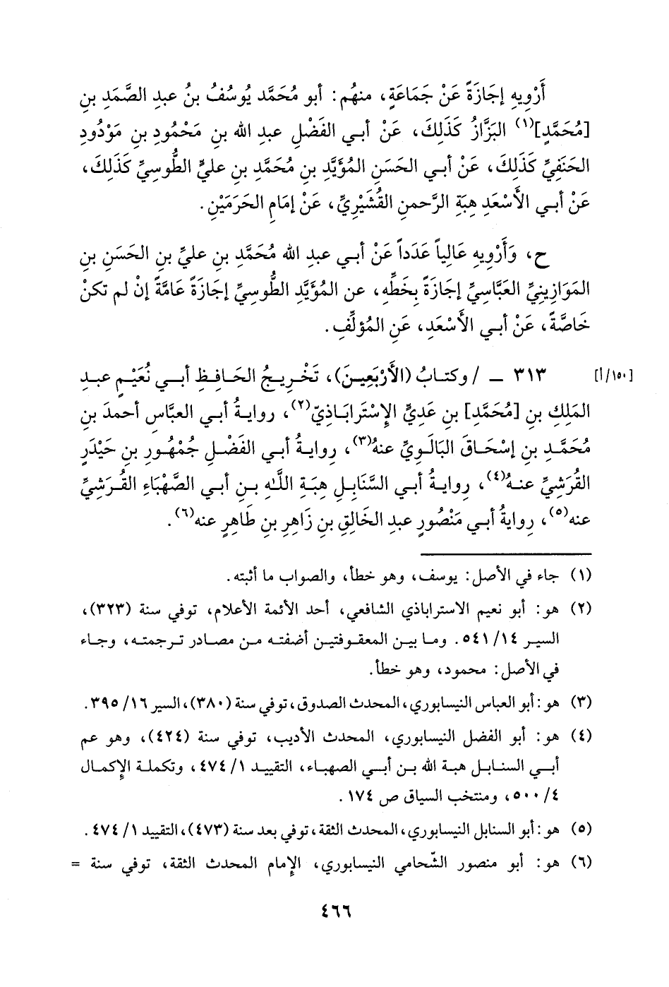 313- وكتاب (الأربعين) ، تخريج الحافظ أبي نعيم عبد الملك بن [محمد] بن عدي الإستراباذي، رواية أبي العباس أحمد بن محمد بن إسحاق البالوي عنه، رواية أبي الفضل جمهور بن حيدر القرشي عنه، رواية أبي السنابل هبة الله بن أبي الصهباء القرشي عنه، رواية أبي منصورٍ عبد الخالق بن زاهر بن طاهر عنه.