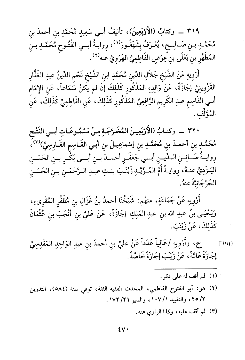319- وكتاب (الأربعين) ، تأليف أبي سعيدٍ محمد بن أحمد بن محمد بن صالحٍ، يعرف بشهفور، رواية أبي الفتوح محمد بن المطهر بن يعلى بن عوض الفاطمي الهروي عنه.