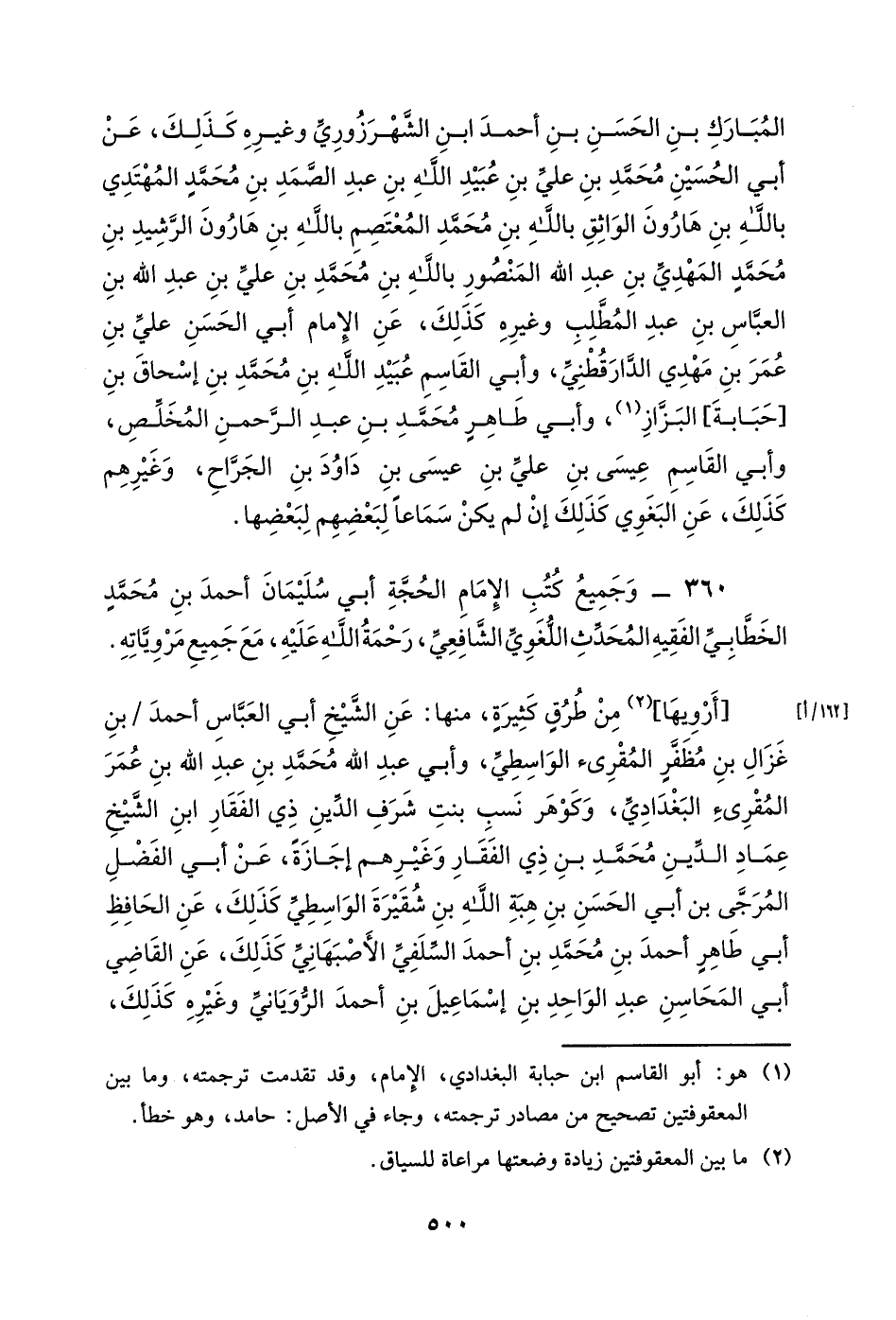 المبارك بن الحسن بن أحمد ابن الشهرزوري وغيره كذلك، عن أبي الحسين محمد بن علي بن عبيد الله بن عبد الصمد بن محمد المهتدي بالله بن هارون الواثق بالله بن محمد المعتصم بالله بن هارون الرشيد بن محمدٍ المهدي بن عبد الله المنصور بالله بن محمد بن علي بن عبد الله بن العباس بن عبد المطلب وغيره كذلك، عن الإمام أبي الحسن علي بن عمر بن مهدي الدارقطني، وأبي القاسم عبيد الله بن محمد بن إسحاق بن [حبابة] البزاز، وأبي طاهرٍ محمد بن عبد الرحمن المخلص، وأبي القاسم عيسى بن علي بن عيسى بن داود بن الجراح، وغيرهم كذلك، عن البغوي كذلك إن لم يكن سماعاً لبعضهم لبعضها.
