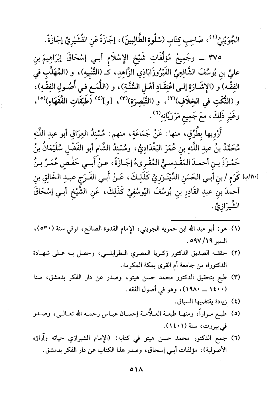375- وجميع مؤلفات شيخ الإسلام أبي إسحاق إبراهيم بن علي بن يوسف الشافعي الفيروزاباذي الزاهد، كـ (التنبيه) ، و (المهذب في الفقه) ، و (الإشارة إلى اعتقاد أهل السنة) ، و (اللمع في أصول الفقه) ، و (النكت في الخلاف) ، و (التبصرة) ، [و] (طبقات الفقهاء) ، وغير ذلك، مع جميع مروياته.