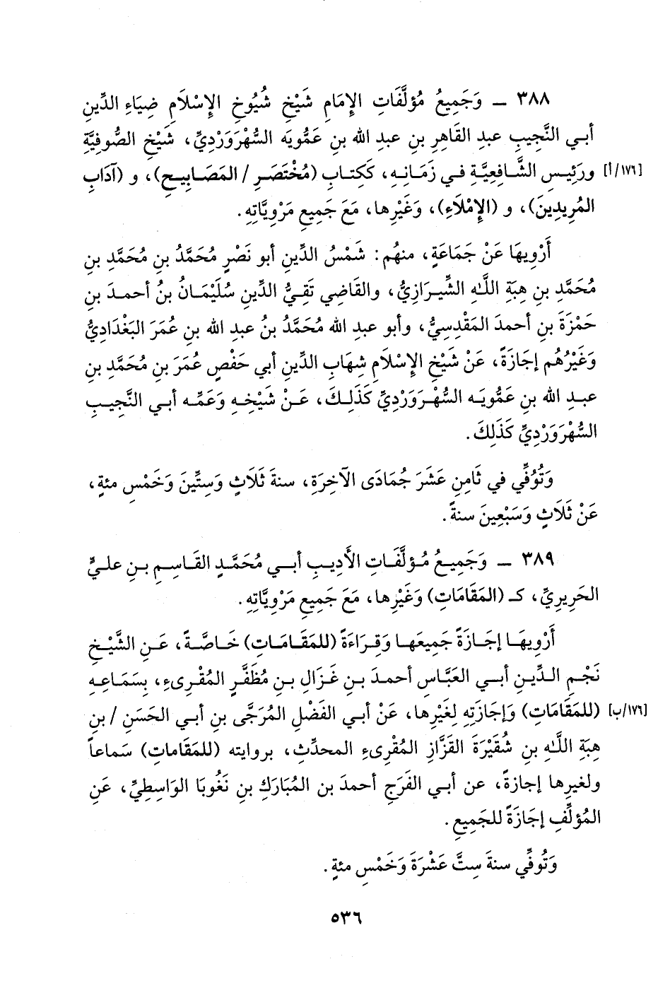 388- وجميع مؤلفات الإمام شيخ الإسلام ضياء الدين أبي النجيب عبد القاهر بن عبد الله بن عمويه السهروردي، شيخ الصوفية ورئيس الشافعية في زمانه، ككتاب (مختصر المصابيح) ، و (آداب المريدين) ، و (الإملاء) ، وغيرها، مع جميع مروياته.