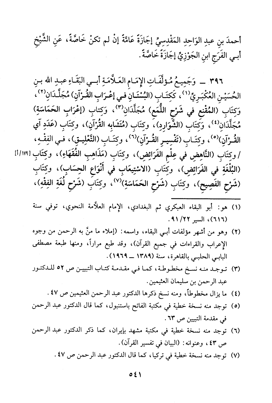 396- وجميع مؤلفات الإمام العلامة أبي البقاء عبد الله بن الحسين العكبري، ككتاب (البستان في إعراب القرآن) مجلدان، وكتاب (المقنع في شرح اللمع) مجلدان، وكتاب (إعراب الحماسة) مجلدان، وكتاب (الشوارد) ، وكتاب (متشابه القرآن) ، وكتاب (عدد آي القرآن) ، وكتاب (تفسير القرآن) ، وكتاب (التعليق) ، في الفقه، وكتاب (الناهض في علم الفرائض) ، وكتاب (مذاهب الفقهاء) ، وكتاب (البلغة في الفرائض) ، وكتاب (الاستيعاب في أنواع الحساب) ، وكتاب (شرح الفصيح) ، وكتاب (شرح الحماسة) ، وكتاب (شرح لغة الفقه) ،
