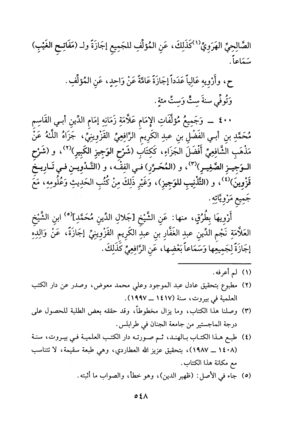 400- وجميع مؤلفات الإمام علامة زمانه إمام الدين أبي القاسم محمد بن أبي الفضل بن عبد الكريم الرافعي القزويني، جزاه الله عن مذهب الشافعي أفضل الجزاء، ككتاب (شرح الوجيز الكبير) ، و (شرح الوجيز الصغير) ، و (المحرر) في الفقه، و (التدوين في تاريخ قزوين) ، و (التذنيب للوجيز) ، وغير ذلك من كتب الحديث وعلومه، مع جميع مروياته.