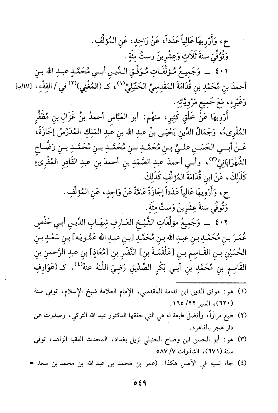 401- وجميع مؤلفات موفق الدين أبي محمد عبد الله بن أحمد بن محمد بن قدامة المقدسي الحنبلي، كـ (المغني) في الفقه وغيره، مع جميع مروياته.