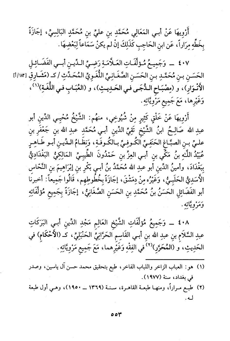 407- وجميع مؤلفات العلامة رضي الدين أبي الفضائل الحسن بن محمد بن الحسن الصغاني اللغوي المحدث كـ (مشارق الأنوار) ، و (مصباح الدجى في الحديث) ، و (العباب في اللغة) ، وغيرها، مع جميع مروياته.