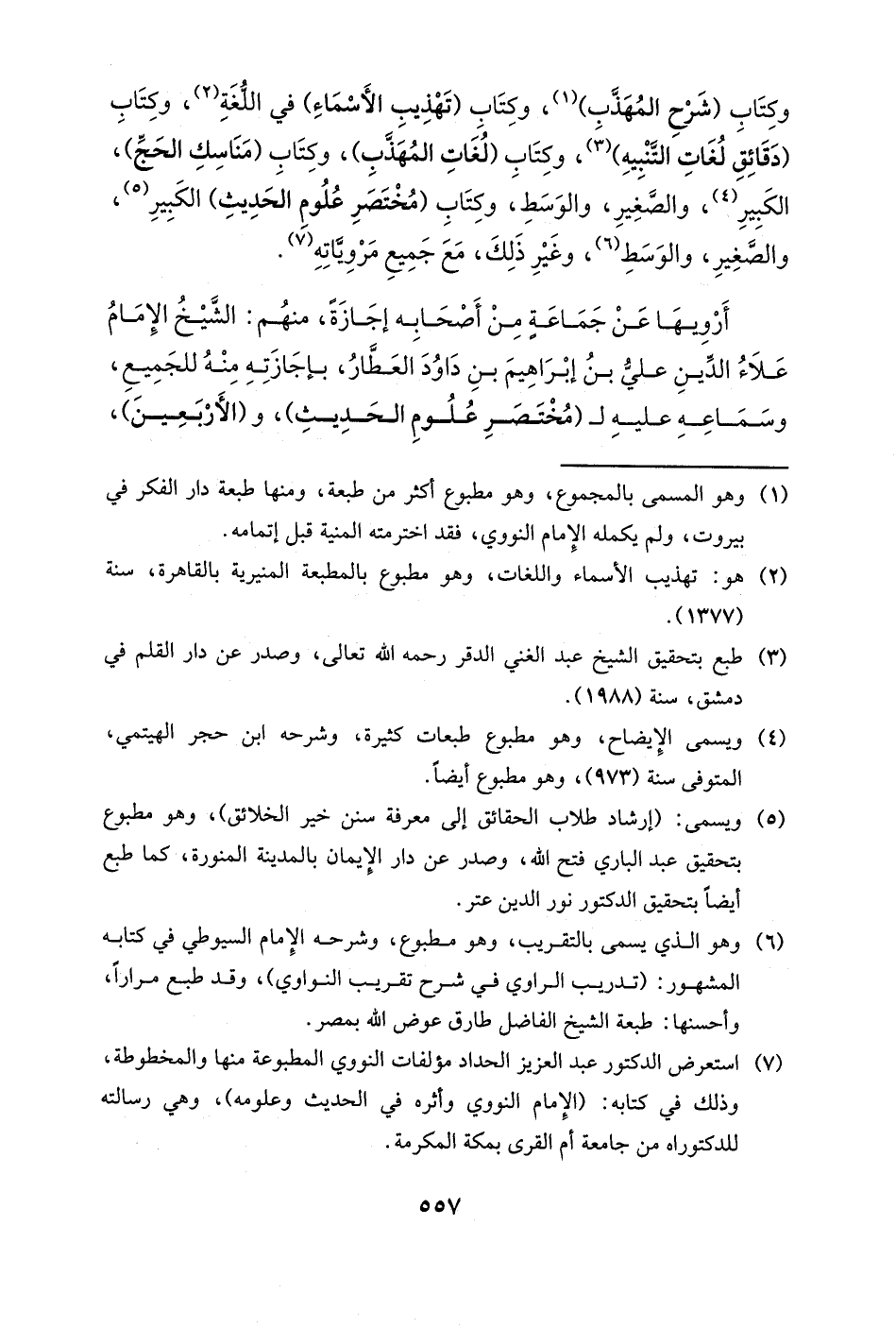 وكتاب (شرح المهذب) ، وكتاب (تهذيب الأسماء) في اللغة، وكتاب (دقائق لغات التنبيه) ، وكتاب (لغات المهذب) ، وكتاب (مناسك الحج) ، الكبير، والصغير، والوسط، وكتاب (مختصر علوم الحديث) الكبير، والصغير، والوسط، وغير ذلك، مع جميع مروياته.