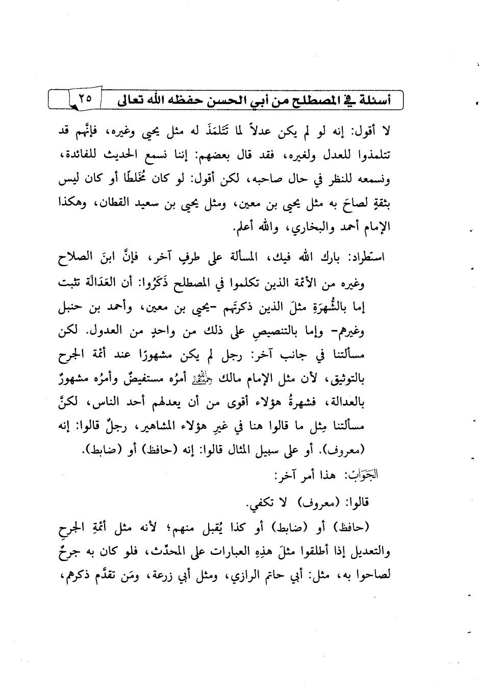 السؤال2 استطراد: بارك الله فيك، المسألة على طرف آخر، فإن ابن الصلاح وغيره من الأئمة الذين تكلموا في المصطلح ذكروا: أن العدالة تثبت إما بالشهرة مثل الذين ذكرتهم -يحيى بن معين، وأحمد بن حنبل وغيرهم- وإما بالتنصيص على ذلك من واحد من العدول، لكن مسألتنا في جانب آخر: رجل لم يكن مشهورًا عند أئمة الجرح بالتوثيق، لأن مثل الإمام مالك رحمه الله تعالى أمره مستفيض وأمره مشهور بالعدالة، فشهرة هؤلاء أقوى من أن يعدلهم أحد الناس لكن مسألتنا مثل ما قالوا هنا في غير هؤلاء المشاهير، رجل قالوا: إنه (معروف). أو على سبيل المثال قالوا: إنه (حافظ) أو (ضابط).