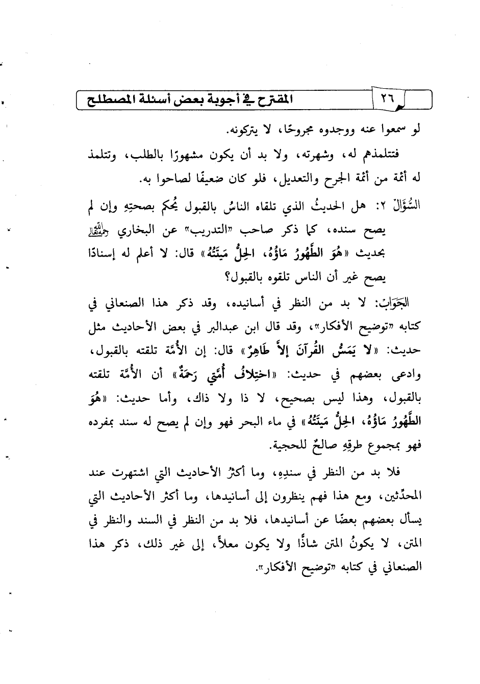 الجواب: لا بد من النظر في أسانيده، وقد ذكر هذا الصنعاني في كتابه "توضيح الأفكار" وقد قال ابن عبد البر في بعض الأحاديث مثل حديث: ((لايمسّ القرآن إلاّ طاهر)) قال: إن الأمة تلقته بالقبول، وادعى بعضهم في حديث: ((اختلاف أمّتي رحمة)) أن الأمة تلقته بالقبول، وهذا ليس بصحيح، لا ذا ولا ذاك، وأما حديث: ((هو الطّهور ماؤه، الحلّ ميتته)) في ماء البحر فهو وإن لم يصح له سند بمفرده فهو بمجموع طرقه صالح للحجية، وإلا فلا بد من النظر في سنده، وما أكثر الأحاديث التي اشتهرت عند المحدثين، ومع هذا فهم ينظرون إلى أسانيدها، وما أكثر الأحاديث التي يسأل بعضهم بعضًا عن أسانيدها، فلا بد من النظر في السند والنظر في المتن، لا يكون المتن شاذًا ولا يكون معلاً، إلى غير ذلك، ذكر هذا الصنعاني في كتابه "توضيح الأفكار"