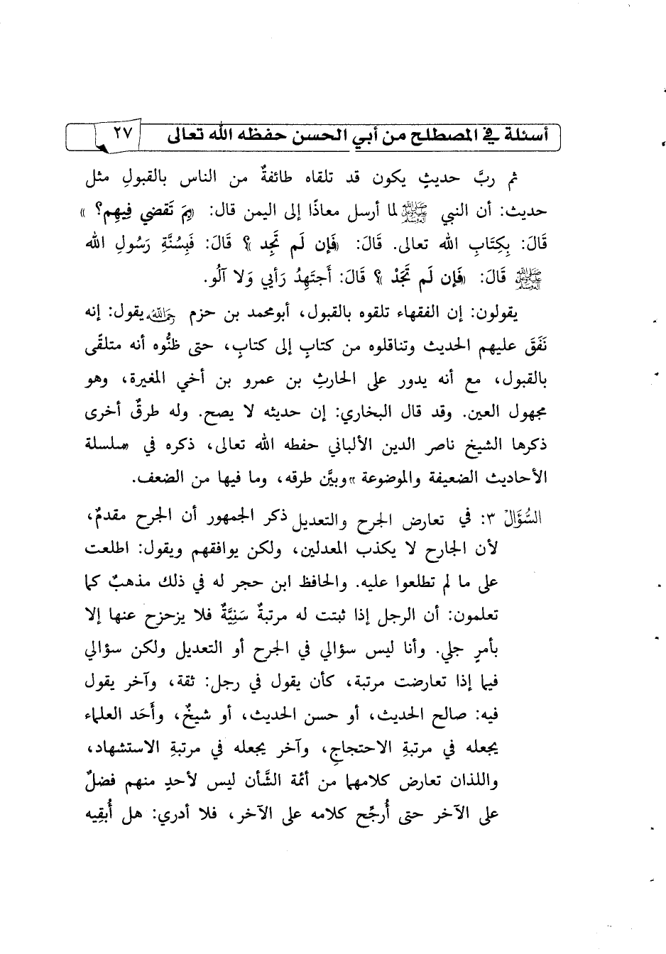 السؤال4 في تعارض الجرح والتعديل ذكر الجمهور أن الجرح مقدم، لأن الجارح لا يكذب المعدلين، ولكن يوافقهم ويقول: اطلعت على ما لم تطلعوا عليه. والحافظ ابن حجر له في ذلك مذهب كما تعلمون: أن الرجل إذا ثبتت له مرتبة سنيّة فلا يزحزح عنها إلا بأمر جلي. وأنا ليس سؤالي في الجرح أو التعديل ولكن سؤالي فيما إذا تعارضت مرتبة، كأن يقول في رجل: ثقة، وآخر يقول فيه: صالح الحديث، أو حسن الحديث، أو شيخ، وأحد العلماء يجعله في مرتبة الاحتجاج، وآخر يجعله في مرتبة الاستشهاد، واللذان تعارض كلامهما من أئمة الشأن ليس لأحد منهم فضل على الآخر حتى أرجّح كلامه على الآخر، فلا أدري: هل أبقيه