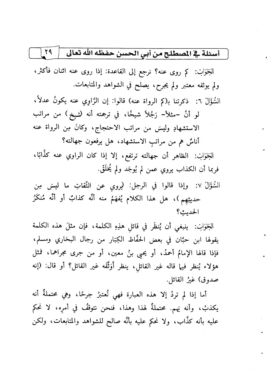 السؤال7 ذكرتنا بكم الرواة عنه قالوا: إن الراوي عنه يكون عدلاً، لو أنّ -مثلاً- رجلاً شيخًا، في ترجمته أنه شيخ من مراتب الاستشهاد وليس من مراتب الاحتجاج، وكان من الرواة عنه أناس هم من مراتب الاستشهاد، هل يرفعون جهالته؟