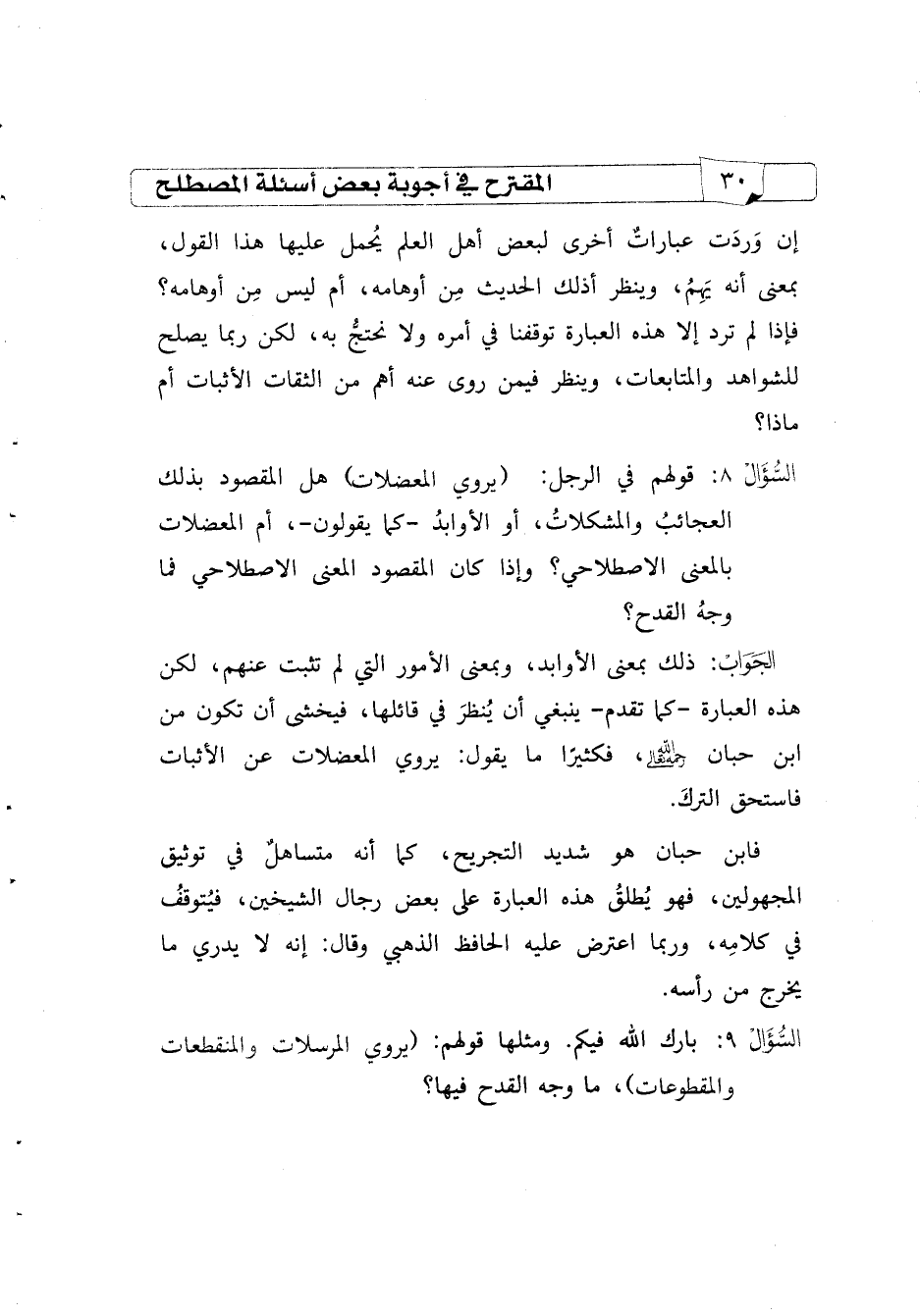 السؤال9 قولهم في الرجل: (يروي المعضلات) هل المقصود بذلك العجائب والمشكلات، أو الأوابد -كما يقولون-، أم المعضلات بالمعنى الاصطلاحي؟ وإذا كان المقصود المعنى الاصطلاحي فما وجه القدح؟