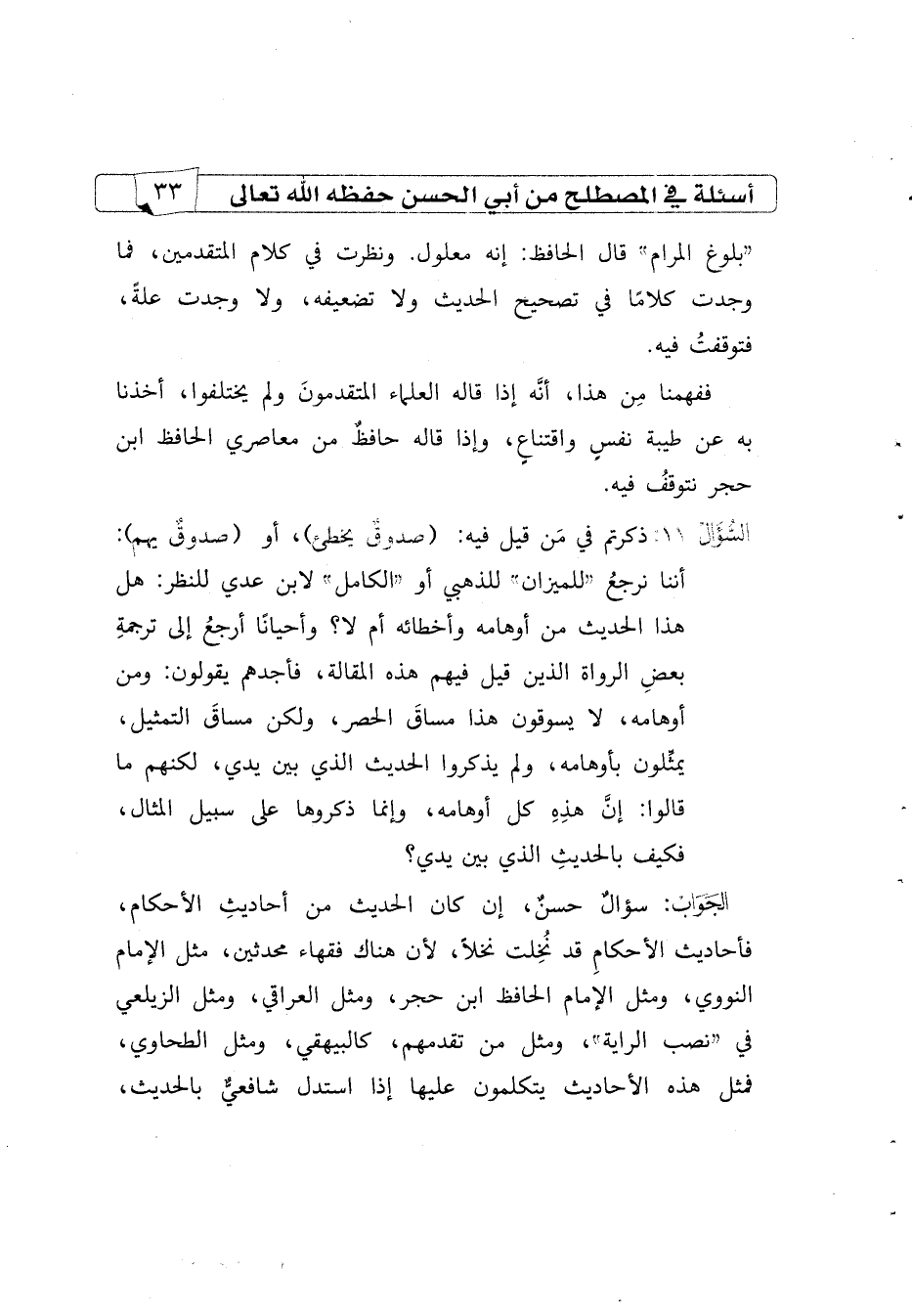السؤال12 ذكرتم في من قيل فيه: (صدوق يخطئ)، أو (صدوق يهم): أننا نرجع "للميزان" للذهبي أو "الكامل" لابن عدي للنظر، هل هذا الحديث من أوهامه وأخطائه، أم لا؟ وأحيانًا أرجع إلى ترجمة بعض الرواة الذين قيل فيهم هذه المقالة، فأجدهم يقولون: ومن أوهامه، لا يسوقون هذا مساق الحصر، ولكن مساق التمثيل، يمثّلون بأوهامه، ولم يذكروا الحديث الذي بين يدي، لكنهم ما قالوا: إن هذه كل أوهامه، وإنما ذكروها على سبيل المثال، فكيف بالحديث الذي بين يدي؟