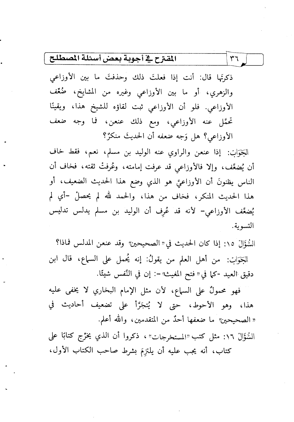 الجواب: إذا عنعن والراوي عنه الوليد بن مسلم (نعم)، فقط خاف أن يضعّف، وإلا فالأوزاعي قد عرفت إمامته، وعرفت ثقته، فخاف أن الناس يظنون أن الأوزاعي هو الذي وضع هذا الحديث الضعيف، أو هذا الحديث المنكر، فخاف من هذا، والحمد لله لم يحصل -أي لم يضعف الأوزاعي- لأنه قد عرف أن الوليد بن مسلم يدلس تدليس التسوية؟