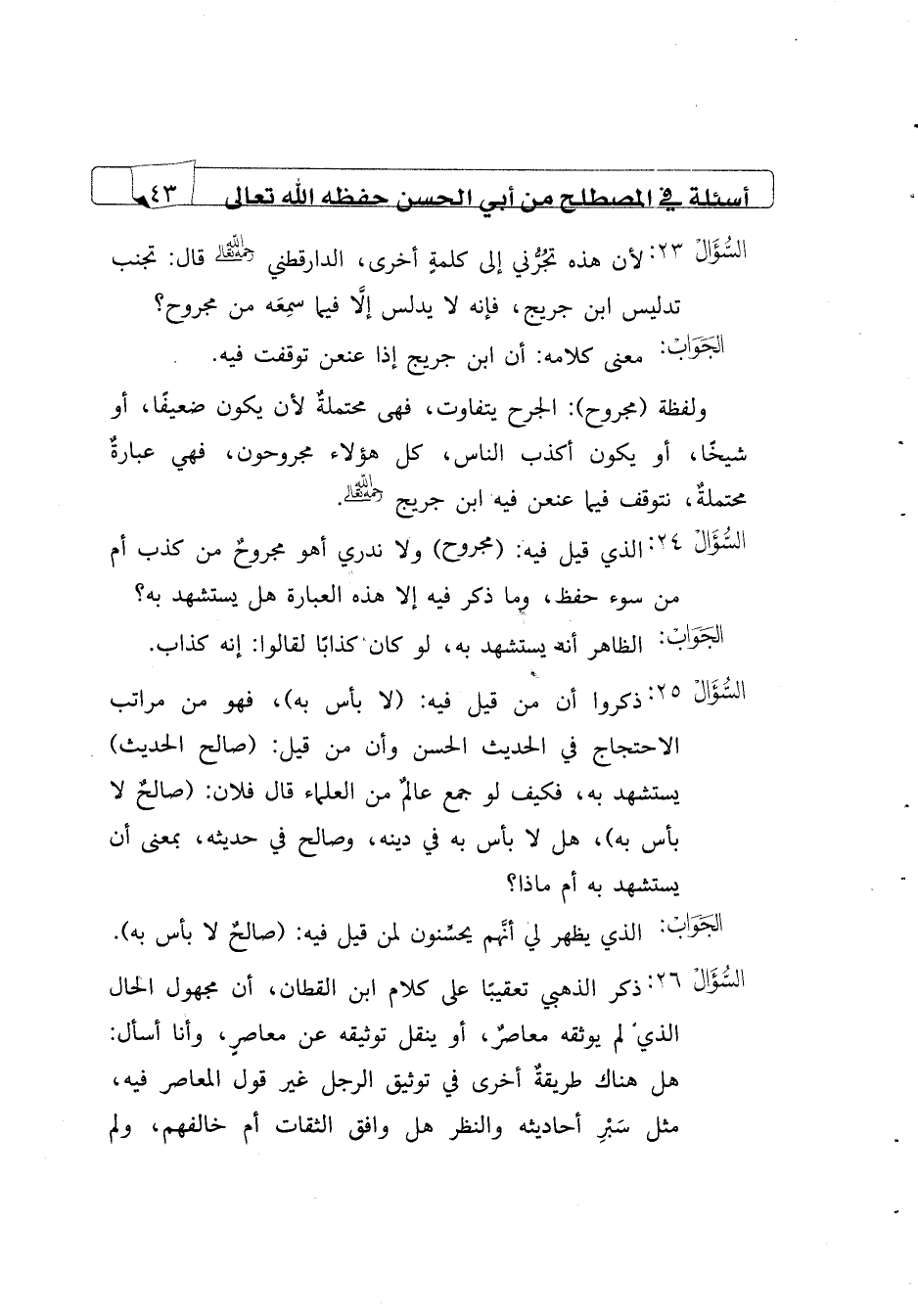 السؤال24 لأن هذه تجرني إلى كلمة أخرى، الدارقطني رحمه الله تعالى قال: تجنب تدليس ابن جريج، فإنه لا يدلس إلا فيما سمعه من مجروح؟