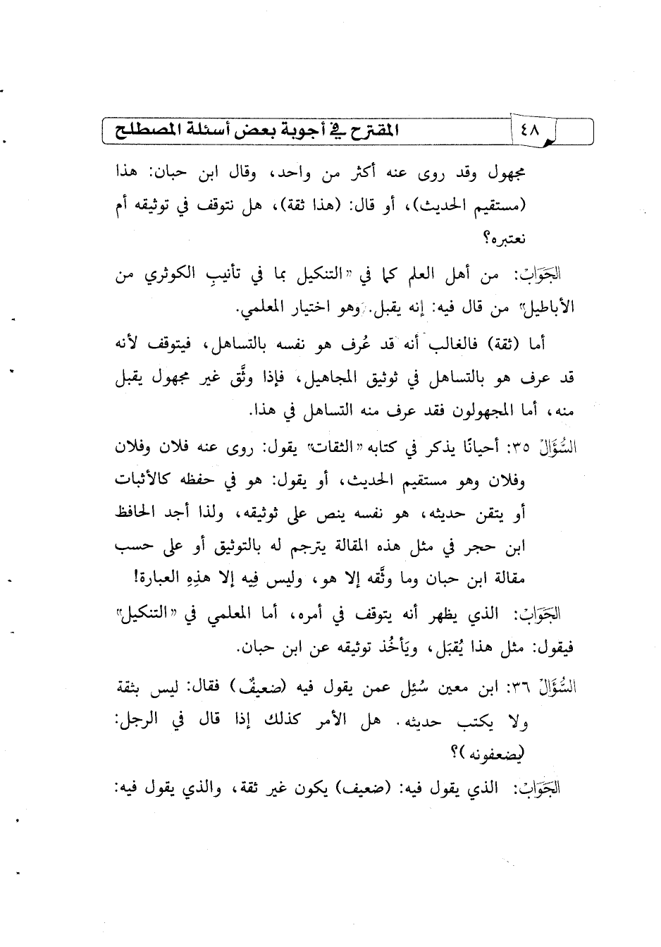 السؤال36 أحيانًا يذكر في كتابه "الثقات" يقول: روى عنه فلان وفلان وفلان وهو مستقيم الحديث، أو يقول: هو في حفظه كالأثبات أو يتقن حديثه، هو نفسه ينص على ثوثيقه، ولذا أجد الحافظ ابن حجر في مثل هذه المقالة يترجم له بالتوثيق أو على حسب مقالة ابن حبان وما وثقه إلا هو، وليس فيه إلا هذه العبارة!