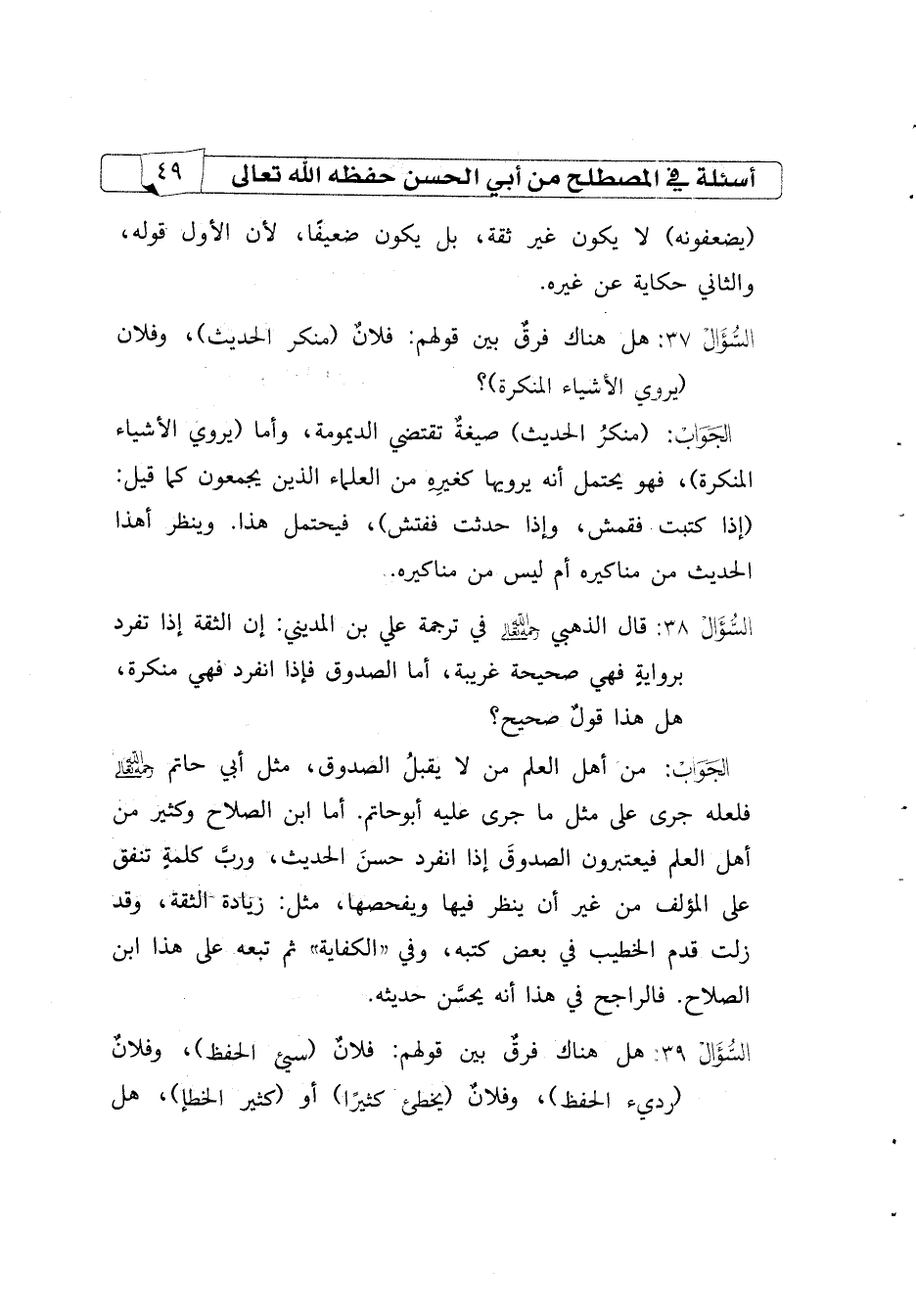السؤال39 قال الذهبي رحمه الله تعالى في ترجمة علي بن المديني: إن الثقة إذا تفرد برواية فهي صحيحة غريبة، أما الصدوق فإذا انفرد فهي منكرة، هل هذا قول صحيح؟