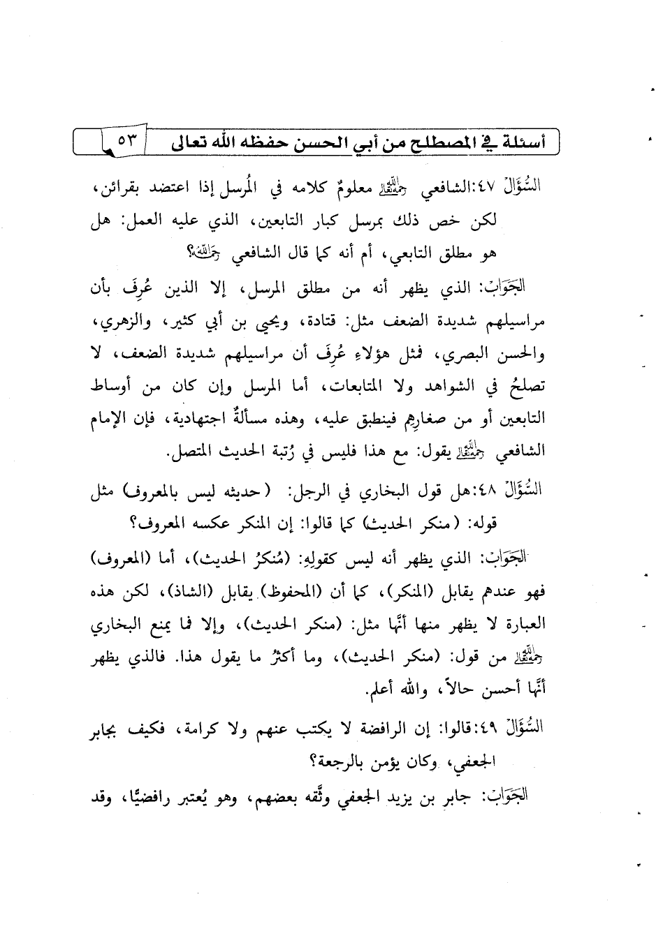 السؤال48 الشافعي رحمه الله تعالى معلوم كلامه في المرسل إذا اعتضد بقرائن، لكن خص ذلك بمرسل كبار التابعين، الذي عليه العمل: هل هو مطلق التابعي، أم أنه كما قال الشافعي رحمه الله تعالى؟