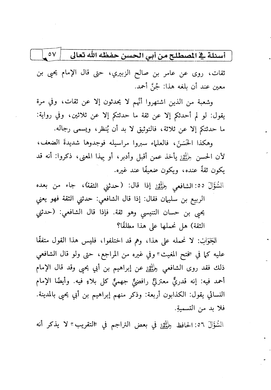 السؤال56 الشافعي رحمه الله تعالى إذا قال: (حدثني الثقة)، جاء من بعده الربيع بن سليمان فقال: إذا قال الشافعي: حدثني الثقة فهو يعني يحيى بن حسان التنيسي وهو ثقة. فإذا قال الشافعي: (حدثني الثقة) هل نحملها على هذا مطلقًا؟