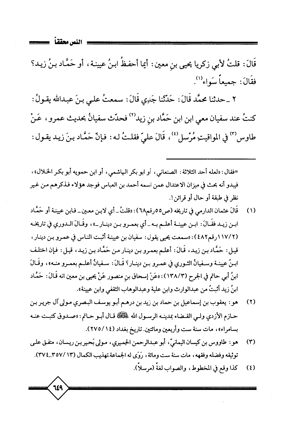 2 - حَدَّثَنَا مُحَمَّدٌ , قَالَ: حَدَّثَنَا جَدِّي , قَالَ: سَمِعْتُ عَلِيَّ بْنَ عَبْدِ اللَّهِ، يَقُولُ: كُنْتُ عِنْدَ سُفْيَانَ مَعِي ابْنُ ابْنِ حَمَّادِ بْنِ زَيْدٍ، فَحَدَّثَ سُفْيَانُ بِحَدِيثِ عَمْرٍو عَنْ طَاوُسٍ فِي الْمَوَاقِيتِ مُرْسَل، قَالَ عَلِيٌّ: فَقُلْتُ لَهُ: فَإِنَّ حَمَّادَ بْنَ زَيْدٍ يَقُولُ عَنِ ابْنِ عَبَّاسٍ، فَقَالَ سُفْيَانُ: احرج عَلَيْكَ بِأَسْمَاءِ اللَّهِ، لَمَا صَدَقْتَ، أَنَا أَعْلَمُ بِعَمْرٍو أَوْ حَمَّادِ بْنِ زَيْدٍ؟ فَبَقِيتُ ثُمَّ قُلْتُ: أَنْتَ يَا أَبَا مُحَمَّدٍ أَعْلَمُ بِعَمْرٍو مِنْ حَمَّادِ بْنِ زَيْدٍ، وَابْنُهُ حَاضِرٌ فَلَمَّا قُمْتُ قَالَ لِي ابْنُ ابْنِهِ: عَرَّضْتَ جَدِّي حِينَ قُلْتَ لَهُ: إِنَّ حَمَّادَ بْنَ زَيْدٍ يَقُولُ: كَذَا وَكَذَا