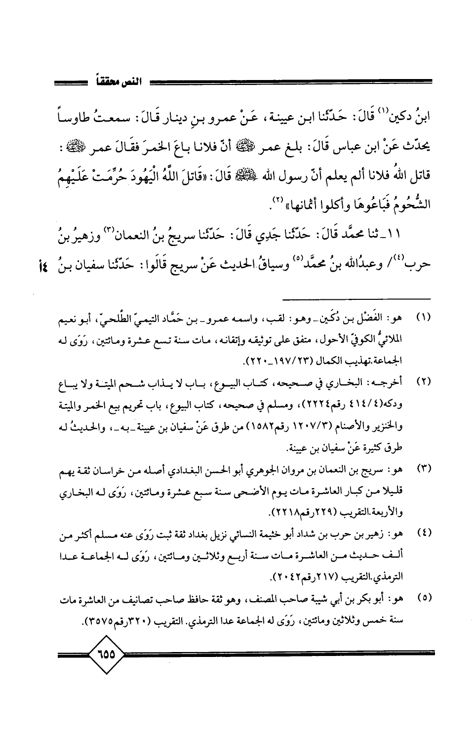 ابْنُ دُكَيْنٍ، قَالَ: حَدَّثَنَا ابْنُ عُيَيْنَةَ، عَنْ عَمْرِو بْنِ دِينَارٍ، قَالَ: سَمِعْتُ طَاوُسًا، يُحَدِّثُ عَنِ ابْنِ عَبَّاسٍ، قَالَ: بَلَغَ عُمَرَ رَضِيَ اللَّهُ عَنْهُ أَنَّ فُلانًا بَاعَ الْخَمْرَ، فَقَالَ عُمَرُ رَضِيَ اللَّهُ عَنْهُ: قَاتَلَ اللَّهُ فُلانَا، أَلَمْ يَعْلَمْ أَنَّ رَسُولَ اللَّهِ صَلَّى اللَّهُ عَلَيْهِ وَسَلَّمَ قَالَ: قَاتَلَ اللَّهُ الْيَهُودَ، حُرِّمَتْ عَلَيْهِمُ الشُّحُومُ فَبَاعُوهَا، وَأَكَلُوا أَثْمَانَهَا.