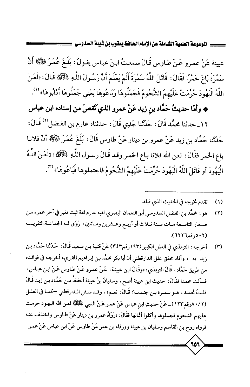 عُيَيْنَةَ، عَنْ عَمْرٍو، عَنْ طَاوُسٍ، قَالَ: سَمِعْتُ ابْنَ عَبَّاسٍ، يَقُولُ: بَلَغَ عُمَرَ رَضِيَ اللَّهُ عَنْهُ، أَنَّ سَمُرَةَ بَاعَ خَمْرًا فَقَالَ: قَاتَلَ اللَّهُ سَمُرَةَ، أَلَمْ يَعْلَمْ أَنَّ رَسُولَ اللَّهِ صَلَّى اللَّهُ عَلَيْهِ وَسَلَّمَ قَالَ: لَعَنَ اللَّهُ الْيَهُودَ، حُرِّمَتْ عَلَيْهِمُ الشُّحُومُ فَجَمَلُوهَا وَبَاعُوهَا جَمَلُوهَا يَعْنِي: أَذَابُوهَا