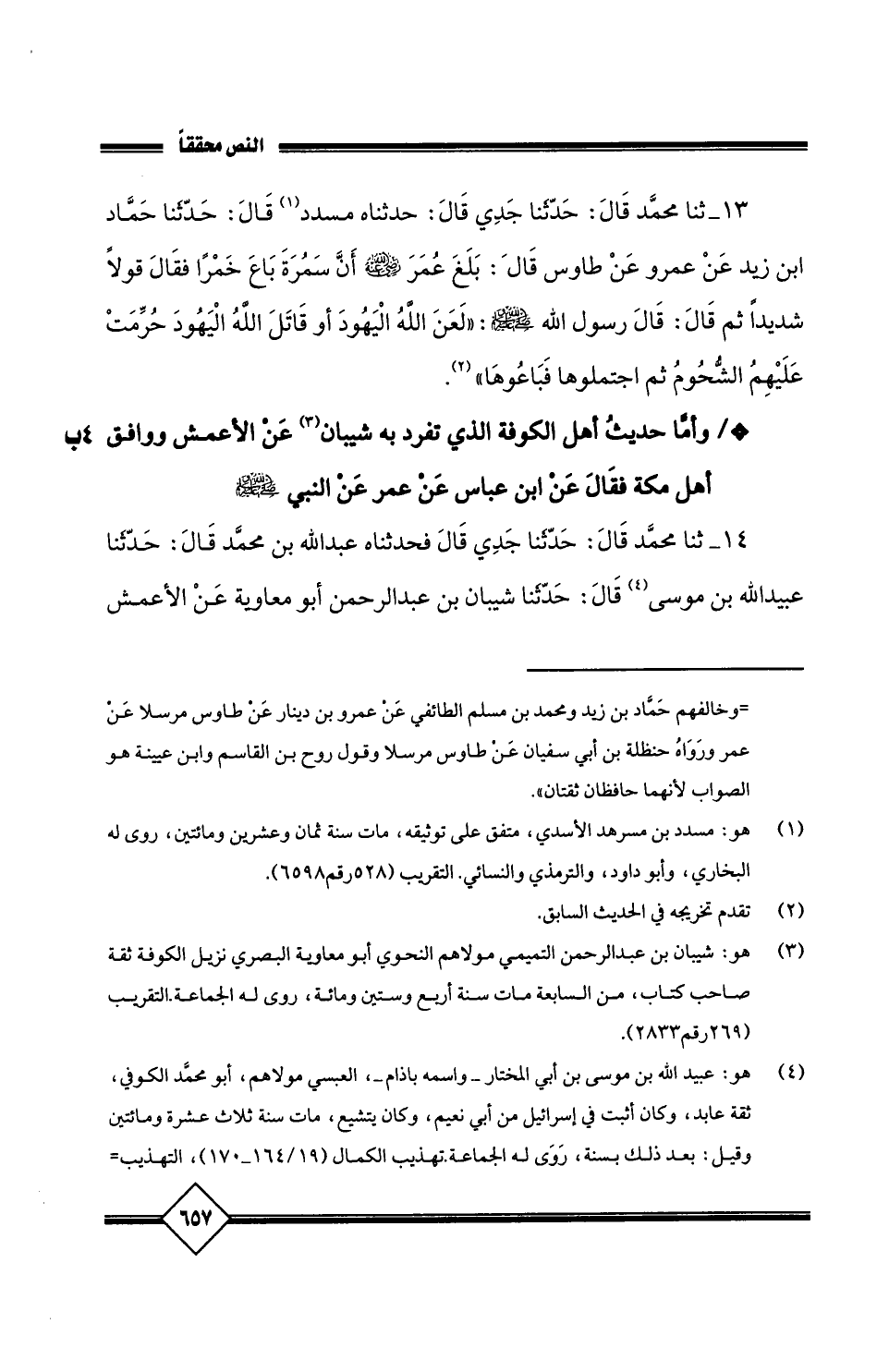 13 - ثنا محمد قال: حدثنا جدي قال: حدثناه مسدد قال: حدثنا حماد بن زيد عن عمرو عن طاوس قال: بلغ عمر رضي الله عنه أن سمرة باع خمرا فقال قولا شديدا ثم قال: قال رسول الله صلى الله عليه وسلم: "لعن الله اليهود أو قاتل الله اليهود حرمت عليهم الشحوم ثم اجتملوها فباعوها".