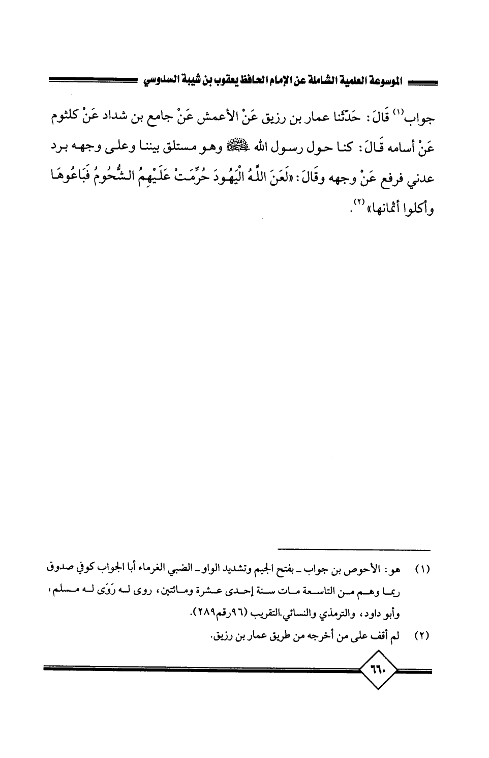 جَوَّابٍ، قَالَ: حَدَّثَنَا عَمَّارُ بْنُ رُزَيْقٍ، عَنِ الأَعْمَشِ، عَنْ جَامِعِ بْنِ شَدَّادٍ، عَنْ كُلْثُومٍ، عَنْ أُسَامَةَ، قَالَ: كُنَّا حَوْلَ رَسُولِ اللَّهِ صَلَّى اللَّهُ عَلَيْهِ وَسَلَّمَ، وَهُوَ مُسْتَلْقٍ بَيْنَنَا، وَعَلَى وَجْهِهِ بُرْدٌ عَدَنِيُّ، فَرَفَعَ عَنْ وَجْهِهِ وَقَالَ: لَعَنَ اللَّهُ الْيَهُودَ، حُرِّمَتْ عَلَيْهِمُ الشُّحُومُ، فَبَاعُوهَا وَأَكَلُوا أَثْمَانَهَا.