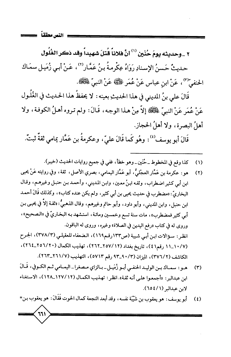 قَالَ عَلِيُّ بْنُ الْمَدِينِيِّ فِي هَذَا الْحَدِيثِ بِعَيْنِهِ: لاَ يُحْفَظُ هَذَا الْحَدِيثُ فِي الْغُلُولِ عَنْ عُمَرَ، عَنِ النَّبِيِّ صَلَّى اللَّهُ عَلَيْهِ وَسَلَّمَ إِلاَّ مِنْ هَذَا الْوَجْهِ. قَالَ: وَلَمْ تَرْوِهِ أَهْلُ الْكُوفَةِ، وَلاَ أَهْلُ الْبَصْرَةِ، وَلاَ أَهْلُ الْحِجَازِ، قَالَ أَبُو يُوسُفَ: وَهُوَ كَمَا قَالَ عَلِيٌّ وَعِكْرِمَةُ بْنُ عَمَّارٍ يَمَامِيُّ ثِقَةٌ ثَبَتٌ.