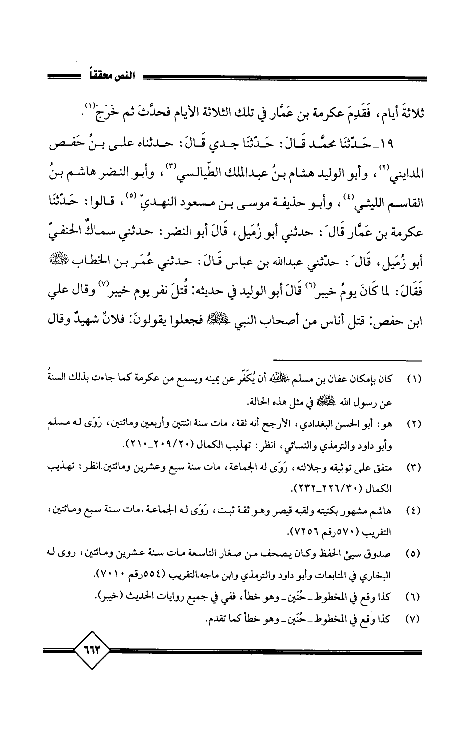 19 - حَدَّثَنَا مُحَمَّدُ، قَالَ: حَدَّثَنَا جَدِّي قَالَ: حَدَّثَنَاهُ عَلِيُّ بْنُ حَفْصٍ الْمَدَايِنِيُّ، وَأَبُو الْوَلِيدِ هِشَامُ بْنُ عَبْدِ الْمَلِكِ الطَّيَالِسِيُّ، وَأَبُو النَّضْرِ هَاشِمُ بْنُ الْقَاسِمِ اللَّيْثِيُّ، وَأَبُو حُذَيْفَةَ مُوسَى بْنُ مَسْعُودٍ النَّهْدِيُّ، قَالُوا: حَدَّثَنَا عِكْرِمَةُ بْنُ عَمَّارٍ، قَالَ: حَدَّثَنِي أَبُو زُمَيْلٍ، قَالَ أَبُو النَّضْرِ: حَدَّثَنِي سِمَاكٌ الْحَنَفِيُّ أَبُو زُمَيْلٍ، قَالَ: حَدَّثَنِي عَبْدُ اللَّهِ بْنُ عَبَّاسٍ، قَالَ: حَدَّثَنِي عُمَرُ بْنُ الْخَطَّابِ، رَضِيَ اللَّهُ عَنْهُ، فَقَالَ: لَمَّا كَانَ يَوْمُ خيبر، قَالَ أَبُو الْوَلِيدِ فِي حَدِيثِهِ: قُتِلَ نَفَرٌ يَوْمَ خيبر، وَقَالَ عَلِيُّ بْنُ حَفْصٍ: قُتِلَ أَنَاسٌ مِنْ أَصْحَابِ النَّبِيِّ صَلَّى اللَّهُ عَلَيْهِ وَسَلَّمَ، فَجَعَلُوا يَقُولُونَ: فُلانٌ شَهِيدٌ، وَقَالَ أَبُو النَّضْرِ، أَقْبَلَ نَفَرٌ مِنْ صَحَابَةِ النَّبِيِّ صَلَّى اللَّهُ عَلَيْهِ وَسَلَّمَ، فَقَالُوا: فُلانٌ شَهِيدٌ حَتَّى مَرُّوا بِرَجُلٍ، فَقَالُوا: فُلانٌ شَهِيدٌ،