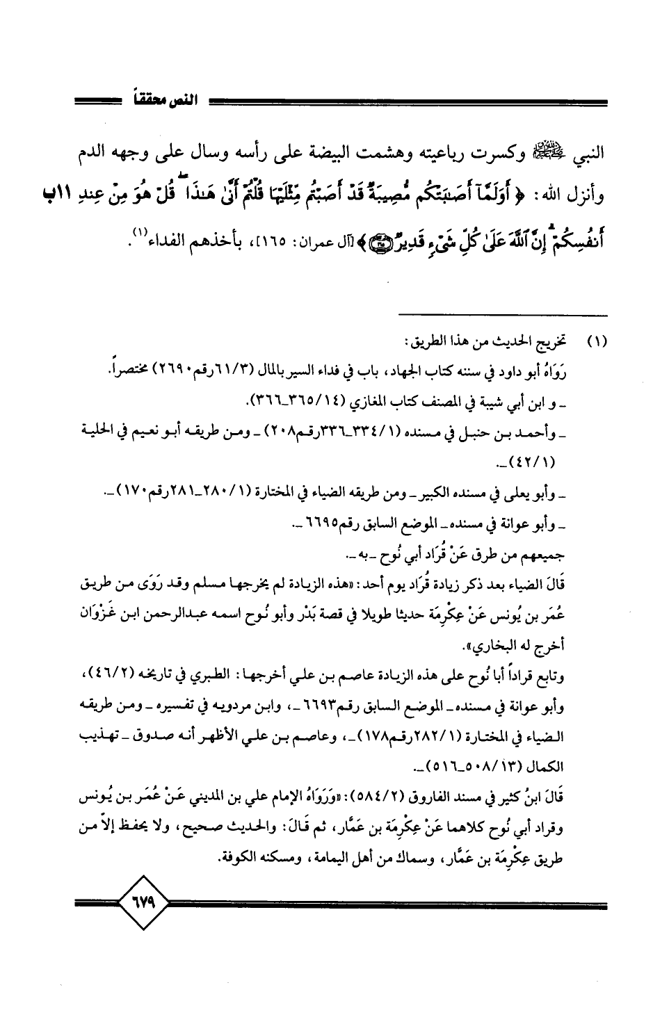 ، وَكُسِرَتْ رَبَاعِيَتُهُ وَهُشِّمَتِ الْبَيْضَةُ عَلَى رَأْسِهِ، وَسَالَ عَلَى وَجْهِهِ الدَّمُ، وَأَنْزَلَ اللَّهُ {أَوَلَمَّا أَصَابَتْكُمْ مُصِيبَةٌ قَدْ أَصَبْتُمْ مِثْلَيْهَا قُلْتُمْ أَنَّى هَذَا قُلْ هُوَ مِنْ عِنْدِ أَنْفُسِكُمْ إِنَّ اللَّهَ عَلَى كُلِّ شَيْءٍ قَدِيرٌ} بِأَخْذِهِمُ الْفِدَاءَ