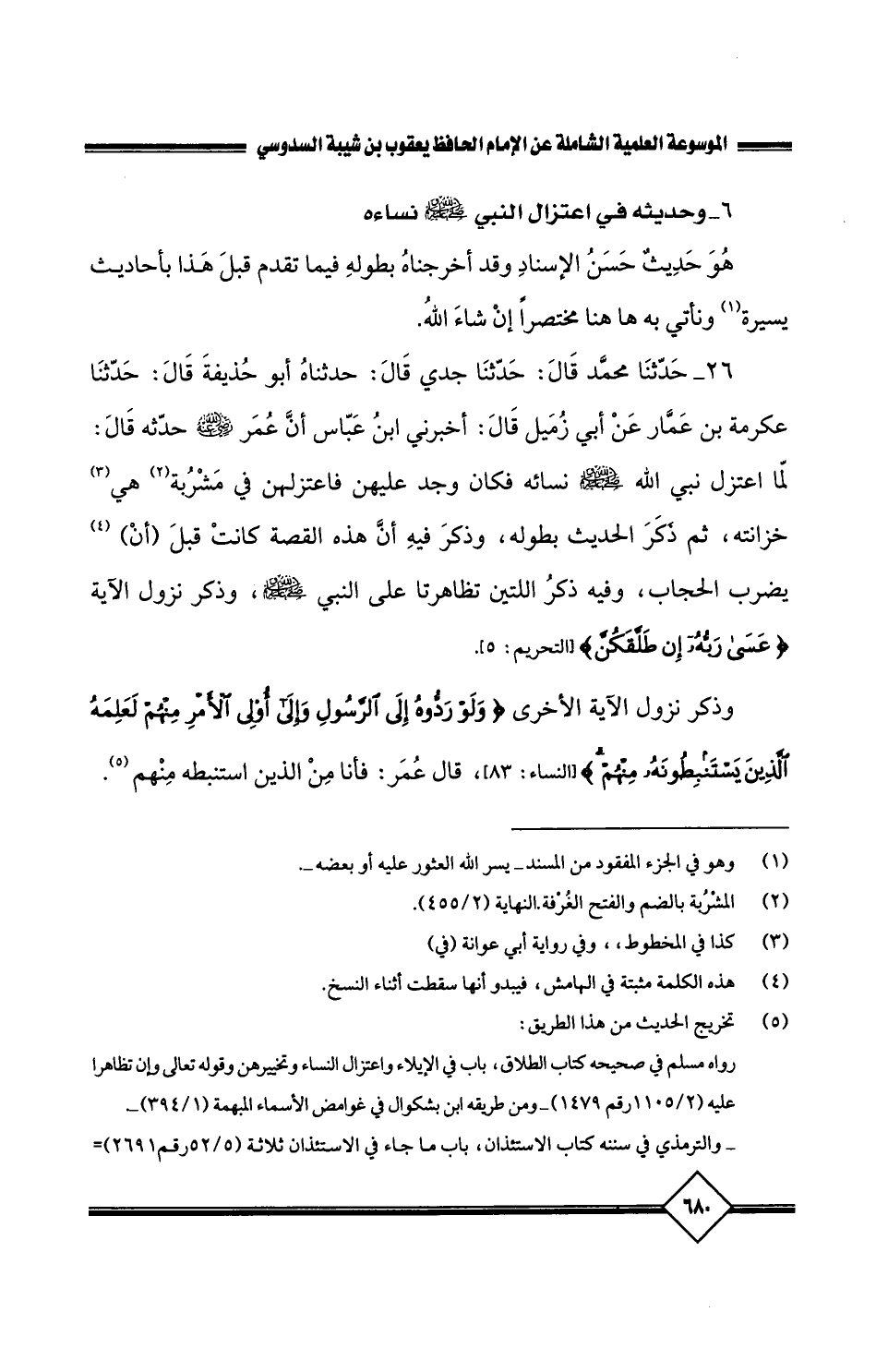 26 - حَدَّثَنَا مُحَمَّدُ، قَالَ: حَدَّثَنَا جَدِّي قَالَ: حَدَّثَنَاهُ أَبُو حُذَيْفَةَ، قَالَ: حَدَّثَنَا عِكْرِمَةُ بْنُ عَمَّارٍ، عَنْ أَبِي زُمَيْلٍ، قَالَ: أَخْبَرَنِي ابْنُ عَبَّاسٍ، أَنَّ عُمَرَ رَضِيَ اللَّهُ عَنْهُ حَدَّثَهُ، قَالَ: لَمَّا اعْتَزَلَ نَبِيُّ اللَّهِ صَلَّى اللَّهُ عَلَيْهِ وَسَلَّمَ نِسَاءَهُ، فَكَانَ وَجَدَ عَلَيْهِنَّ فَاعْتَزَلَهُنَّ فِي مَشْرُبَةٍ، هِيَ خِزَانَتُهُ ثُمَّ ذَكَرَ الْحَدِيثَ بِطُولِهِ، وَذَكَرَ فِيهِ أَنَّ هَذِهِ الْقِصَّةَ كَانَتْ قَبْلَ أَنْ يُضْرَبَ الْحِجَابُ، وَفِيهِ ذَكَرَ اللَّتَيْنِ تَظَاهَرَتَا عَلَى النَّبِيِّ صَلَّى اللَّهُ عَلَيْهِ وَسَلَّمَ، وَذَكَرَ نُزُولَ الآيَةِ {عَسَى رَبُّهُ إِنْ طَلَّقَكُنَّ} وَذَكَرَ نُزُولَ الآيَةِ الأُخْرَى {وَلَوْ رَدُّوهُ إِلَى الرَّسُولِ وَإِلَى أُولِي الأَمْرِ مِنْهُمْ لَعَلِمَهُ الَّذِينَ يَسْتَنْبِطُونَهُ مِنْهُمْ} قَالَ عُمَرُ:فَأَنَا مِنَ الَّذِينَ اسْتَنْبَطَهُ مِنْهُمْ