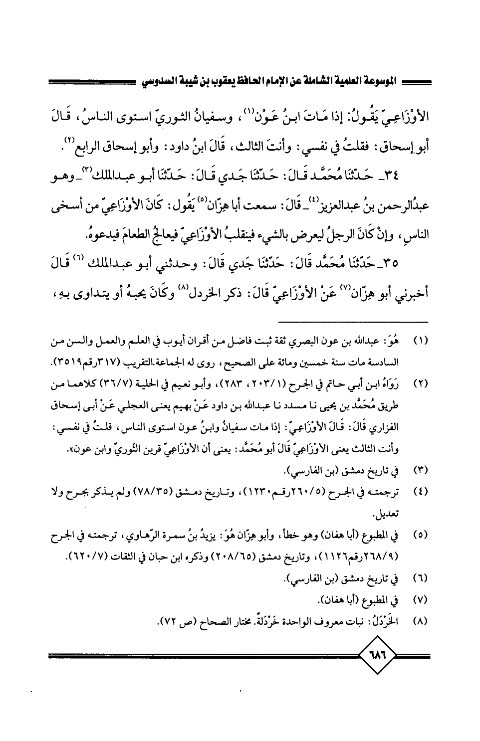 34 - حَدَّثَنَا مُحَمَّدٌ , قَالَ: حَدَّثَنَا جَدِّي , قَالَ: حَدَّثَنَا أَبُو عَبْدِ الْمَلِكِ وَهُو عَبْدُ الرَّحْمَنِ بْنُ عَبْدِ الْعَزِيزِ، قَالَ: سَمِعْتُ أَبَا هزان، يَقُولُ: كَانَ الأَوْزَاعِيُّ مِنْ أَسْخَى النَّاسِ، إِنْ كَانَ الرَّجُلُ لَيَعْرِضُ بِالشَّيْءِ فَيَنْقَلِبُ الأَوْزَاعِيُّ فَيُعَالِجُ الطَّعَامَ فَيَدَعُوهُ.