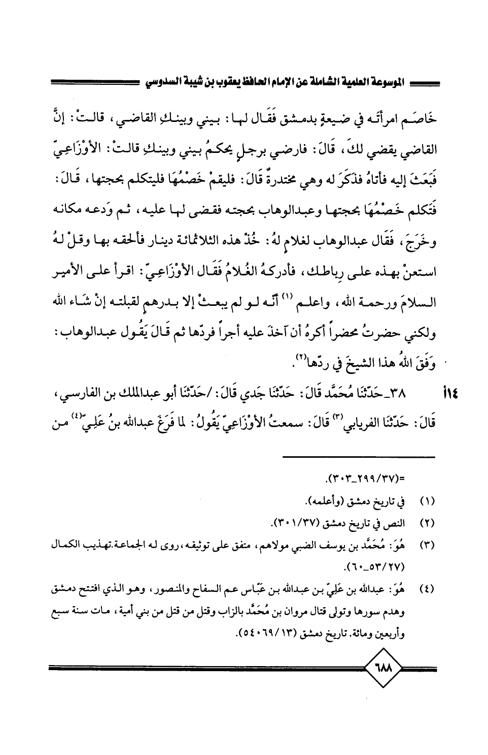 38 - حَدَّثَنَا مُحَمَّدٌ , قَالَ: حَدَّثَنَا جَدِّي , قَالَ: حَدَّثَنَا أَبُو عَبْدِ الْمَلِكِ بْنُ الْفَارِسِيِّ، قَالَ حَدَّثَنَا الْفِرْيَابِيُّ، قَالَ: سَمِعْتُ الأَوْزَاعِيَّ، يَقُولُ: لَمَّا فَرَغَ عَبْدُ اللَّهِ بْنُ عَلِيٍّ مِنْ قَتْلِ بَنِي أُمَيَّةَ، بَعَثَ إِلَيَّ وَكَانَ قَتَلَ يَوْمَئِذٍ نَيِّفًا وَسَبْعِينَ بِالْكَافِرِ كُوبَاتٍ إِلاَّ رَجُلاً وَاحِدًا فَدَخَلْتُ عَلَيْهِ، وَقَدْ أَقَامَ أُولَئِكَ الْجُنْدَ بِالسُّيُوفِ وَالْعُمُدِ، قَالَ: فَدَخَلْتُ فَسَلَّمْتُ، فَأَشَارَ بِيَدِهِ، فَقَعَدْتُ فَقَالَ: مَا تَقُولُ فِي دِمَاءِ بَنِي أُمَيَّةَ؟ فَحِدْتُ، قَالَ: قَدْ عَلِمْتَ مِنْ حَيْثُ حِدَتَ أَجِبْ إِلَيَّ مَا سَأَلْتُكَ؟ قَالَ: وَمَا لَقِيتُ مُفَوَّهًا مِثْلَهُ قَطُّ، قَالَ: فَحِدْتُ أَيْضًا، فَقُلْتُ: كَانَ لَهُمْ عَلَيْكَ عَهْدٌ، وَإِنْ كَانَ يَنْبَغِي لَكَ أَنْ تَفِيَ لَهُمْ بِالْعَهْدِ الَّذِي جَعَلْتَهُ، قَالَ: فَقَالَ لِي: مَا جَعَلَنِي وَإِيَّاهُمْ وَلاَ عَهْدَ لَهُمْ عَلَيَّ، مَا تَقُولُ فِي دِمَائِهِمْ؟ قُلْتُ: هِيَ عَلَيْكَ حَرَامٌ،