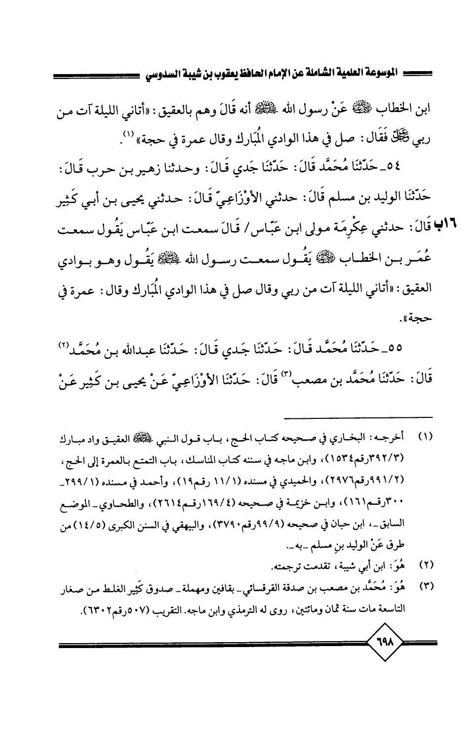 54 - حَدَّثَنَا مُحَمَّدُ، قَالَ: حَدَّثَنَا جَدِّي قَالَ: وحدثنا زهير بن حرب قال: حَدَّثَنَا الْوَلِيدُ بْنُ مُسْلِمٍ، قَالَ: حَدَّثَنَي الأَوْزَاعِيُّ قال حدثني يَحْيَى بْنِ أَبِي كَثِيرٍ قال حدثني عِكْرِمَةَ مولى ابن عباس قال سمعت ابْنِ عَبَّاسٍ يقول سمعت عُمَرَ بْنِ الْخَطَّابِ، رَضِيَ اللَّهُ عَنْهُ يقول: سمعت رَسُولِ اللَّهِ صَلَّى اللَّهُ عَلَيْهِ وَسَلَّمَ يقول وهو بوادي الْعَقِيقِ: أَتَانِي اللَّيْلَةَ آتٍ مِنْ رَبِّي وقَالَ: صَلِّ فِي هَذَا الْوَادِي الْمُبَارَكِ، وَقَالَ: عُمْرَةٌ فِي حَجَّةٍ