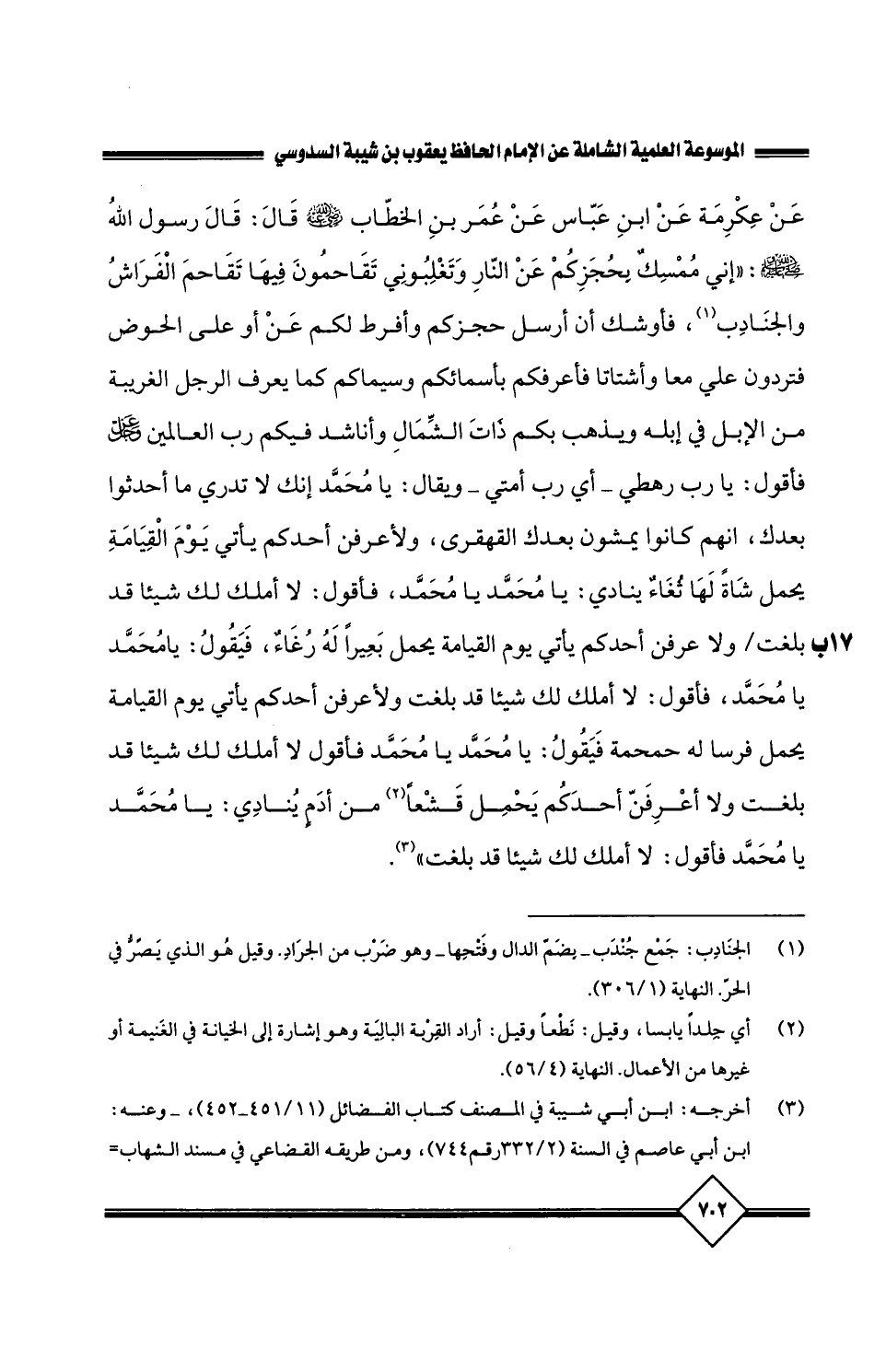فَأَقُولُ: يَا رَبِّ رَهْطِي، أَيْ رَبِّ أُمَّتِي، وَيُقَالُ: يَا مُحَمَّدُ إِنَّكَ لا تَدْرِي مَا أَحْدَثُوا بَعْدَكَ، إِنَّهُمْ كَانُوا يَمْشُونَ بَعْدَكَ الْقَهْقَرَى، وَلأَعْرِفَنَّ أَحَدَكُمْ يَأْتِي يَوْمَ الْقِيَامَةِ يَحْمِلُ شَاةً لَهَا ثُغَاءٌ، يُنَادِي: يَا مُحَمَّدُ، يَا مُحَمَّدُ، فَأَقُولُ: لا أَمْلِكُ لَكَ شَيْئًا قَدْ بَلَّغْتُ، وَلأَعْرِفَنَّ أَحَدَكُمْ يَأْتِي يَوْمَ الْقِيَامَةِ يَحْمِلُ بَعِيرًا لَهُ رَغًاء، فَيَقُولُ: يَا مُحَمَّدُ، يَا مُحَمَّدُ، فَأَقُولُ: لا أَمْلِكُ لَكَ شَيْئًا قَدْ بَلَّغْتُ، وَلأَعْرِفَنَّ أَحَدَكُمْ يَأْتِي يَوْمَ الْقِيَامَةِ يَحْمِلُ فَرَسًا لَهُ حَمْحَمَةٌ، فَيَقُولُ يَا مُحَمَّدُ، يَا مُحَمَّدُ، فَأَقُولُ: لا أَمْلِكُ لَكَ شَيْئًا قَدْ بَلَّغْتُ، وَلأَعْرِفَنَّ أَحَدَكُمْ يَحْمِلُ قَشْعَا مِنْ أَدَمٍ يُنَادِي: يَا مُحَمَّدُ، يَا مُحَمَّدُ، فَأَقُولُ لا أَمْلِكُ لَكَ شَيْئًا قَدْ بَلَّغْتُ.