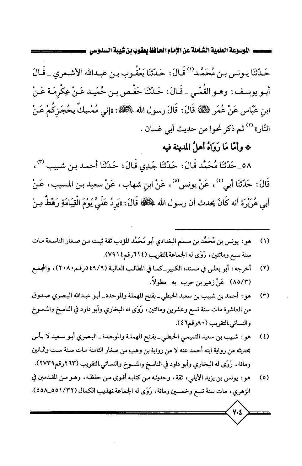 58 - حَدَّثَنَا مُحَمَّدُ، قَالَ: حَدَّثَنَا جَدِّي قَالَ: حَدَّثَنَا أَحْمَدُ بْنُ شَبِيبٍ، قَالَ: حَدَّثَنَا أَبِي، عَنْ يُونُسَ، عَنِ ابْنِ شِهَابٍ، عَنْ سَعِيدِ بْنِ الْمُسَيِّبِ، عَنْ أَبِي هُرَيْرَةَ، أَنَّهُ كَانَ يُحَدِّثُ أَنَّ رَسُولَ اللَّهِ صَلَّى اللَّهُ عَلَيْهِ وَسَلَّمَ، قَالَ: يَرِدُ عَلَيَّ يَوْمَ الْقِيَامَةِ رَهْطٌ مِنْ أَصْحَابِي فَيُحلّئونَ عَنِ الْحَوْضِ فَأَقُولَ: يَا رَبِّ أَصْحَابِي فَيَقُولُ: إِنَّكَ لا عَلِمَ لَكَ بِمَا أَحْدَثُوا بَعْدَكَ، إِنَّهُمُ ارْتَدُّوا عَلَى أَدْبَارِهِمُ الْقَهْقَرَى