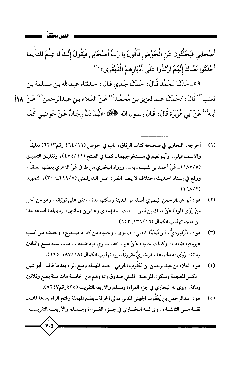 59 - حَدَّثَنَا مُحَمَّدُ، قَالَ: حَدَّثَنَا جَدِّي قَالَ: حَدَّثَنَاهُ عَبْدُ اللَّهِ بْنُ مَسْلَمَةَ بْنِ قَعْنَبٍ، قَالَ: حَدَّثَنَا عَبْدُ الْعَزِيزِ بْنُ مُحَمَّدٍ، عَنِ الْعَلاءِ بْنِ عَبْدِ الرَّحْمَنِ، عَنْ أَبِيهِ، عَنْ أَبِي هُرَيْرَةَ، قَالَ: قَالَ رَسُولُ اللَّهِ صَلَّى اللَّهُ عَلَيْهِ وَسَلَّمَ: لَيُذَادَنَّ رِجَالٌ، عَنْ حَوْضِي كَمَا يُذَادُ الْبَعِيرُ الضَّالُّ، أُنَادِيهِمْ: أَلا هَلُمَّ فَيُقَالُ: إِنَّهُمْ قَدْ بَدَّلُوا بَعْدَكَ، فَأَقُولُ سُحْقًا سُحْقًا