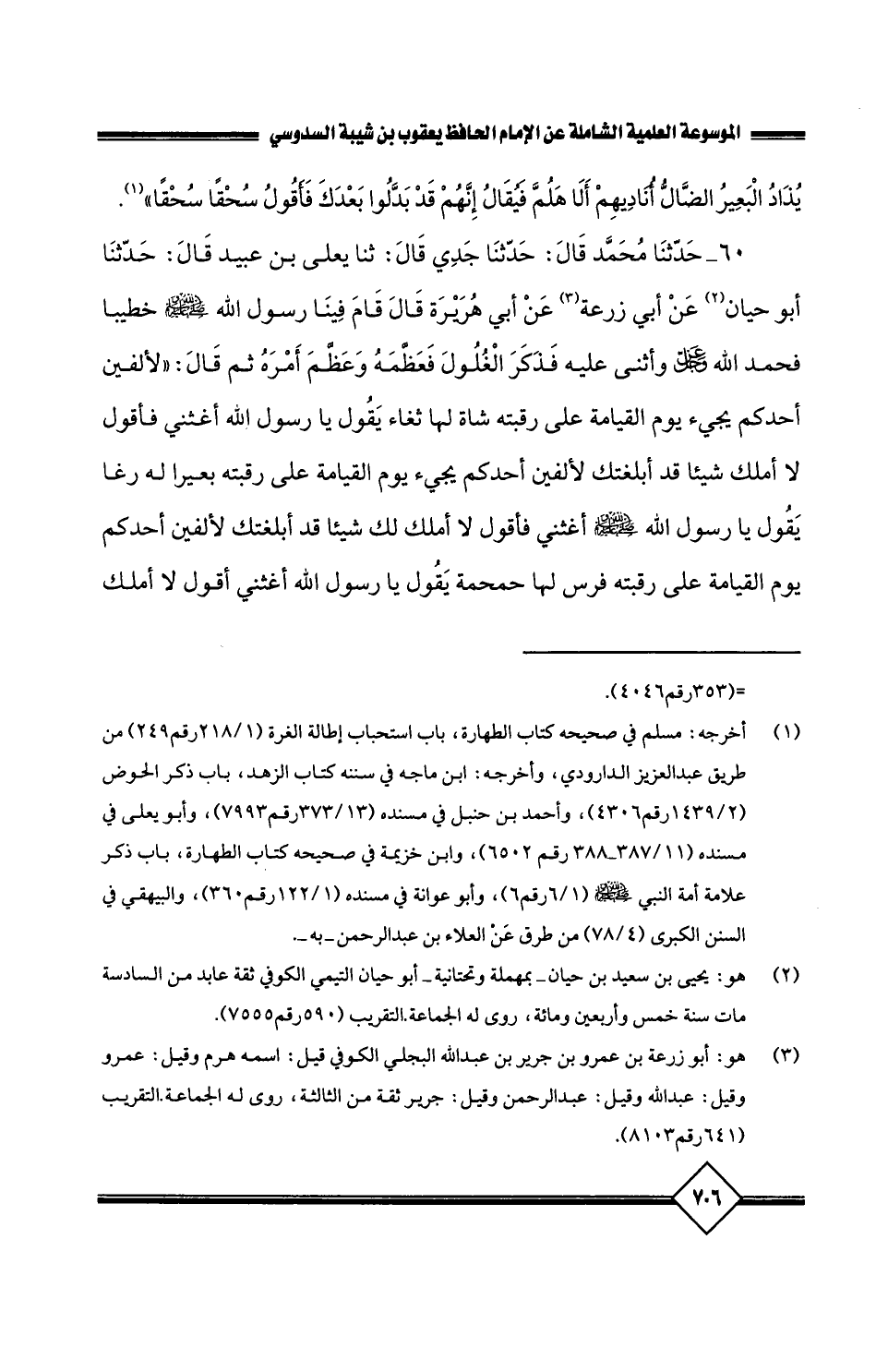 60 - حَدَّثَنَا مُحَمَّدُ، قَالَ: حَدَّثَنَا جَدِّي قَالَ: حَدَّثَنَا يَعْلَى بْنُ عُبَيْدٍ، قَالَ: حَدَّثَنَا أَبُو حَيَّانَ، عَنْ أَبِي زُرْعَةَ، عَنْ أَبِي هُرَيْرَةَ، قَالَ: قَامَ فِينَا رَسُولُ اللَّهِ صَلَّى اللَّهُ عَلَيْهِ وَسَلَّمَ خَطِيبًا، فَحَمِدَ اللَّهَ عَزَّ وَجَلَّ، وَأَثْنَى عَلَيْهِ، ثُمَّ ذَكَرَ الْغُلُولَ، فَعَظَّمَهُ وَعَظَّمَ أَمْرَهُ ثُمَّ قَالَ: لأُلْفَيَنَّ أَحَدَكُمْ يَجِيءُ يَوْمَ الْقِيَامَةِ عَلَى رَقَبَتِهِ شَاةٌ لَهَا ثُغَاءٌ، يَقُولُ: يَا رَسُولَ اللَّهِ أَغِثْنِي، فَأَقُولُ: لا أَمْلِكُ شَيْئًا قَدْ أَبْلَغْتُكَ، لأُلْفَيَنَّ أَحَدَكُمْ يَجِيءُ يَوْمَ الْقِيَامَةِ عَلَى رَقَبَتِهِ بَعِيرٌ لَهُ رُغَا يَقُولُ: يَا رَسُولَ اللَّهِ صَلَّى اللَّهُ عَلَيْهِ وَسَلَّمَ، أَغِثْنِي فَأَقُولُ لا أَمْلِكُ لَكَ شَيْئًا قَدْ أَبْلَغْتُكَ، لأُلْفَيَنَّ أَحَدَكُمْ يَوْمَ الْقِيَامَةِ عَلَى رَقَبَتِهِ فَرَسٌ لَهَا حَمْحَمَةٌ،