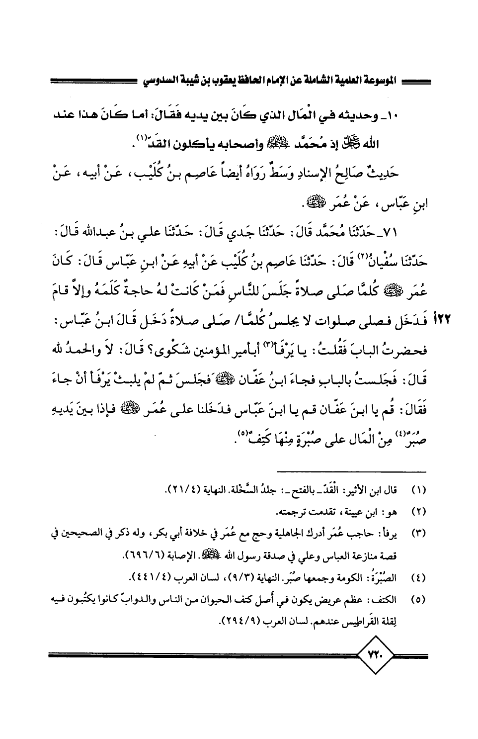 71 - حَدَّثَنَا مُحَمَّدٌ , قَالَ: حَدَّثَنَا جَدِّي , قَالَ: حَدَّثَنَا عَلِيُّ بْنُ عَبْدِ اللَّهِ، قَالَ: حَدَّثَنَا سُفْيَانُ، قَالَ: حَدَّثَنَا عَاصِمُ بْنُ كُلَيْبٍ، عَنْ أَبِيهِ، عَنِ ابْنِ عَبَّاسٍ، قَالَ: كَانَ عُمَرُ رَضِيَ اللَّهُ عَنْهُ كُلَّمَا صَلَّى صَلاَةً جَلَسَ لِلنَّاسِ، فَمَنْ كَانَتْ لَهُ حَاجَةٌ كَلَّمَهُ، وَإِلاَّ قَامَ فَدَخَلَ فَصَلَّى صَلَوَاتٍ لاَ يَجْلِسُ، كُلَّمَا صَلَّى صَلاَةً دَخَلَ. قَالَ ابْنُ عَبَّاسٍ: فَحَضَرْتُ الْبَابَ فَقُلْتُ: يَا يَرْفَأُ أَبِأَمِيرِ الْمُؤْمِنِينَ شَكْوى؟ قَالَ: لاَ وَالْحَمْدُ لِلَّهِ، قَالَ: فَجَلَسْتُ بِالْبَابِ فَجَاءَ ابْنُ عَفَّانَ رَضِيَ اللَّهُ عَنْهُ فَجَلَسَ، ثُمَّ لَمْ يَلْبَثْ يَرْفَأَُ أَنْ جَاءَ فَقَالَ: قُمْ يَا ابْنَ عَفَّانَ، قُمْ يَا ابْنَ عَبَّاسٍ، فَدَخَلْنَا عَلَى عُمَرَ رَضِيَ اللَّهُ عَنْهُ، فَإِذَا بَيْنَ يَدَيْهِ صُبَرُ مِنَ الْمَالِ عَلَى صُبَرَةٍ، مِنْهَا كَتِفٌ، فَقَالَ: إِنِّي نَظَرْتُ فِي أَهْلِ الْمَدِينَةِ فَوَجَدْتُكُمَا مِنْ أَكْثَرِ أَهْلِ الْمَدِينَةِ عَشِيرَةً فَخُذَا هَذَا الْمَالَ فَأَقْسِمَاهُ فَإِنْ كَانَ فَضْلاً فَرَدَّاهُ قَالَ: فَأَمَّا عُثْمَانُ بْنُ عَفَّانَ فَحَثَا،