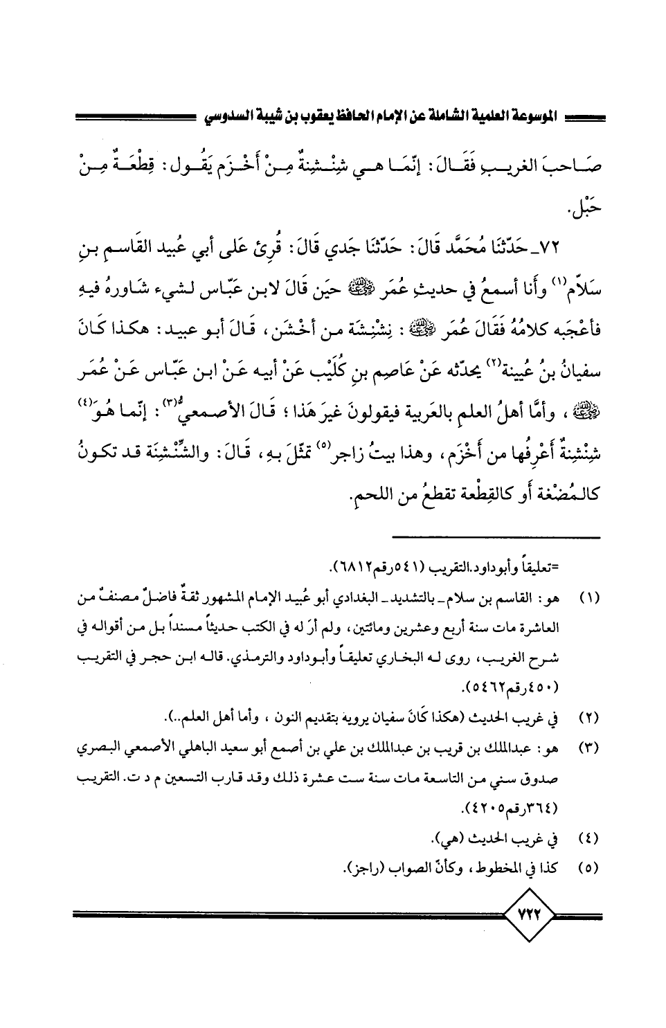 72 - حَدَّثَنَا مُحَمَّدٌ , قَالَ: حَدَّثَنَا جَدِّي , قَالَ: قُرِئَ عَلَى أَبِي عُبَيْدٍ الْقَاسِمِ بْنِ سَلاَّمٍ، وَأَنَا أَسْمَعُ، فِي حَدِيثِ عُمَرَ رَضِيَ اللَّهُ عَنْهُ حِينَ قَالَ لاِبْنِ عَبَّاسٍ: لِشَيْءٍ شَاوَرَهُ فِيهِ فَأَعْجَبَهُ كَلاَمُهُ، فَقَالَ عُمَرُ رَضِيَ اللَّهُ عَنْهُ: نِشْنِشَةٌ مِنْ أَخْشَنَ قَالَ أَبُو عُبَيْدٍ: هَكَذَا كَانَ سُفْيَانُ بْنُ عُيَيْنَةَ يُحَدِّثُهُ عَنْ عَاصِمِ بْنِ كُلَيْبٍ، عَنْ أَبِيهِ عَنِ ابْنِ عَبَّاسٍ، عَنْ عُمَرَ رَضِيَ اللَّهُ عَنْهُ وَأَمَّا أَهْلُ الْعِلْمِ بِالْعَرَبِيَّةِ، فَيَقُولُونَ غَيْرَ هَذَا، قَالَ الأَصْمَعِيُّ: إِنَّمَا هُوَ شِنْشِنَةٌ أَعْرِفُهَا مِنْ أَخْزَمَ، وَهَذَا بَيْتُ زاجَز (1) تَمَثَّلَ بِهِ، قال: قَالَ: وَالشِّنْشِنَةُ قَدْ تَكُونُ كَالْمُضْغَةِ أَوِ الْقِطْعَةِ تُقْطَعُ مِنَ اللَّحْمِ.