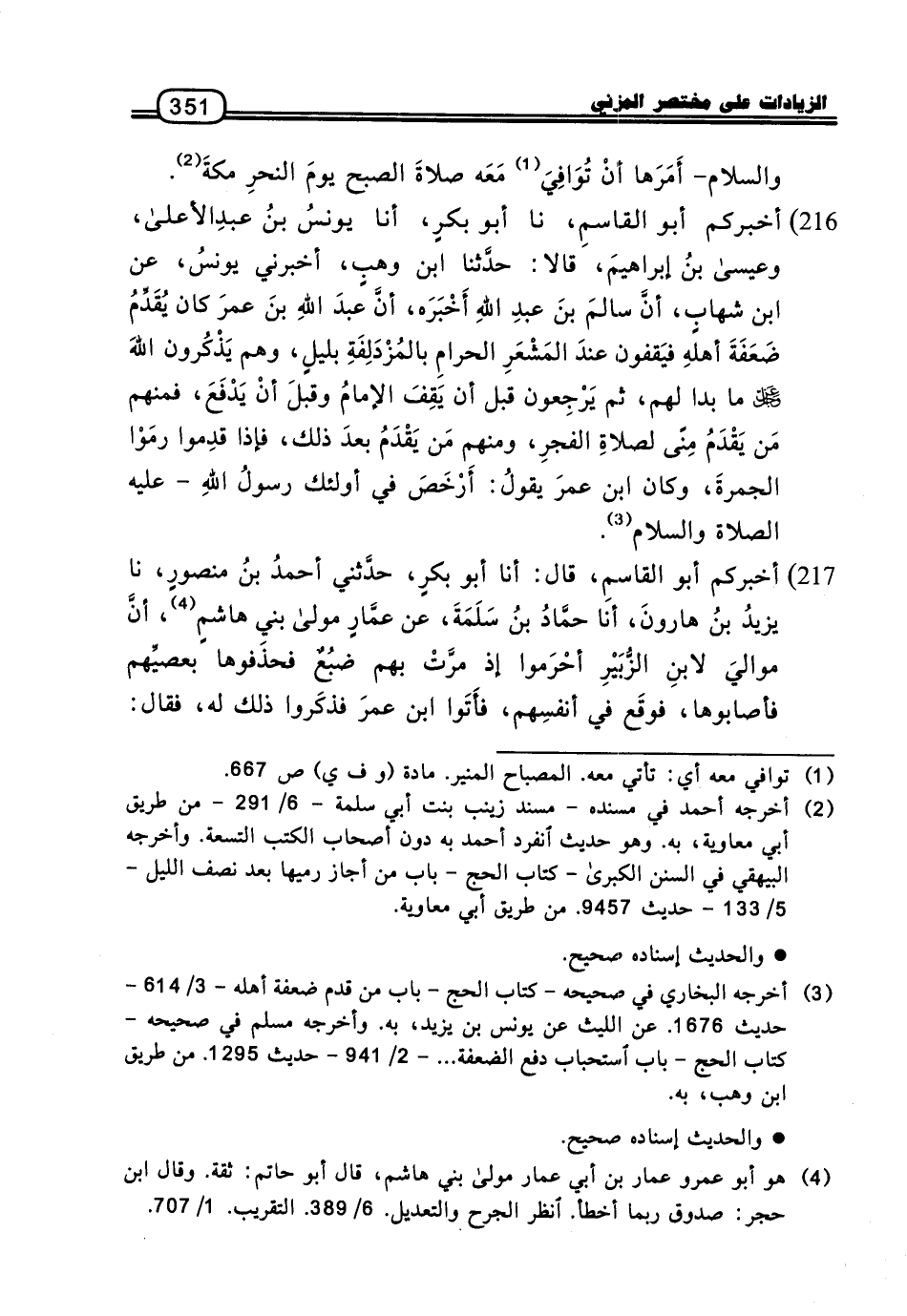 216 - أَخْبَرَكُمْ أَبُو الْقَاسِمِ، نا أَبُو بَكْرٍ، أنا يُونُسُ بْنُ عَبْدِ الأَعْلَى، وَعِيسَى بْنُ إِبْرَاهِيمَ، قَالا: حَدَّثَنَا ابْنُ وَهْبٍ، أَخْبَرَنِي يُونُسُ، عَنِ ابْنِ شِهَابٍ، أَنَّ سَالِمَ بْنَ عَبْدِ اللَّهِ أَخْبَرَهُ، أَنَّ عَبْدَ اللَّهِ بْنَ عُمَرَ كَانَ يُقَدِّمُ ضَعَفَةَ أَهْلِهِ فَيَقِفُونَ عِنْدَ الْمَشْعَرِ الْحَرَامِ بِالْمُزْدَلِفَةِ بِلَيْلٍ، وَهُمْ يَذْكُرُونَ اللَّهَ عَزَّ وَجَلَّ مَا بَدَا لَهُمْ، ثُمَّ يَرْجِعُونَ قَبْلَ أَنْ يَقِفَ الإِمَامُ وَقَبْلَ أَنْ يَدْفَعَ، فَمِنْهُمْ مَنْ يَقْدَمُ مِنًى لِصَلاةِ الْفَجْرِ، وَمِنْهُمْ مَنْ يَقْدَمُ بَعْدَ ذَلِكَ، فَإِذَا قَدِمُوا رَمَوُا الْجَمْرَةَ، وَكَانَ ابْنُ عُمَرَ يَقُولُ: أَرْخَصَ فِي أُولَئِكَ رَسُولُ اللَّهِ، عَلَيْهِ الصَّلاةُ وَالسَّلامُ