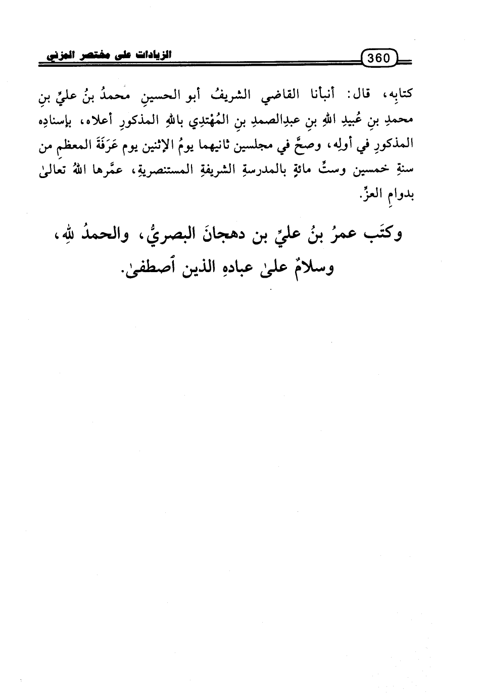 وَكَتَبَ عُمَرُ بْنُ عَلِيِّ بْنِ دَهْجَانَ الْبَصْرِيُّ، وَالْحَمْدُ للَّهِ، وَسَلامٌ عَلَى عِبَادِهِ الَّذِينَ اصْطَفَى.