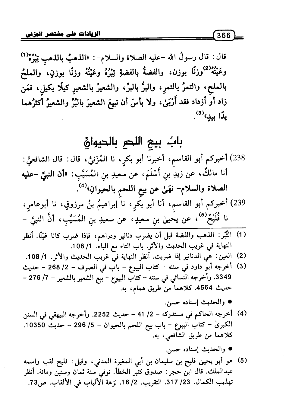 238 - أَخْبَرَكُمْ أَبُو الْقَاسِمِ، أَخْبَرَنَا أَبُو بَكْرٍ، نا الْمُزَنِيُّ، قَالَ: قَالَ الشَّافِعِيُّ: أنا مَالِكٌ، عَنْ زَيْدِ بْنِ أَسْلَمَ، عَنْ سَعِيدِ بْنِ الْمُسَيِّبِ: «أَنَّ النَّبِيَّ، عَلَيْهِ الصَّلاةُ وَالسَّلامُ، نَهَى عَنْ بَيْعِ اللَّحْمِ بِالْحَيَوَانِ»
