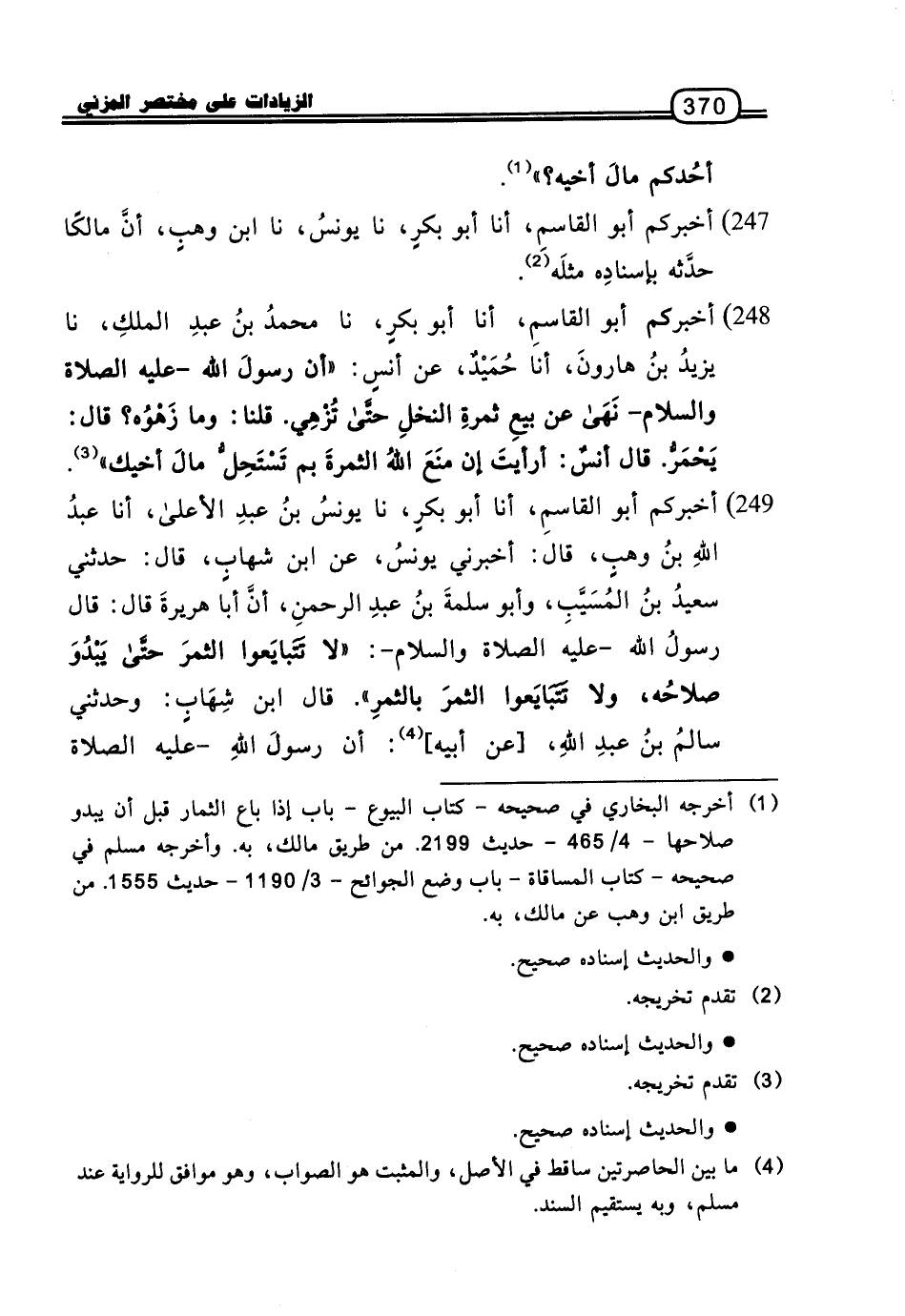 248 - أَخْبَرَكُمْ أَبُو الْقَاسِمِ، أنا أَبُو بَكْرٍ، نا مُحَمَّدُ بْنُ عَبْدِ الْمَلِكِ، نا يَزِيدُ بْنُ هَارُونَ، أنا حُمَيْدٌ، عَنْ أَنَسٍ: " أَنَّ رَسُولَ اللَّهِ، عَلَيْهِ الصَّلاةُ وَالسَّلامُ، نَهَى عَنْ بَيْعِ ثَمَرَةِ النَّخْلِ حَتَّى تُزْهِيَ.